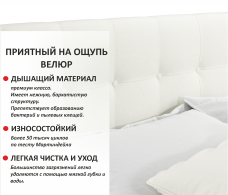Кровать Selesta имеет рельефную мягкую спинку с неглубокими стяжками, которые придают особую изысканность изголовью. Рельефная спинка кровати декорирована декоративными пуговицами. Обивка мягкой спинки и весь периметр 2 спальной кровати выполнен из мебельной ткани – велюр. Это уникальный материал, который получается за счет сплетения пяти волокон одновременно. Дорогая ткань велюр придает кровати более величественный благородный вид. Ткань износостойкая, легко чиститься от загрязнений