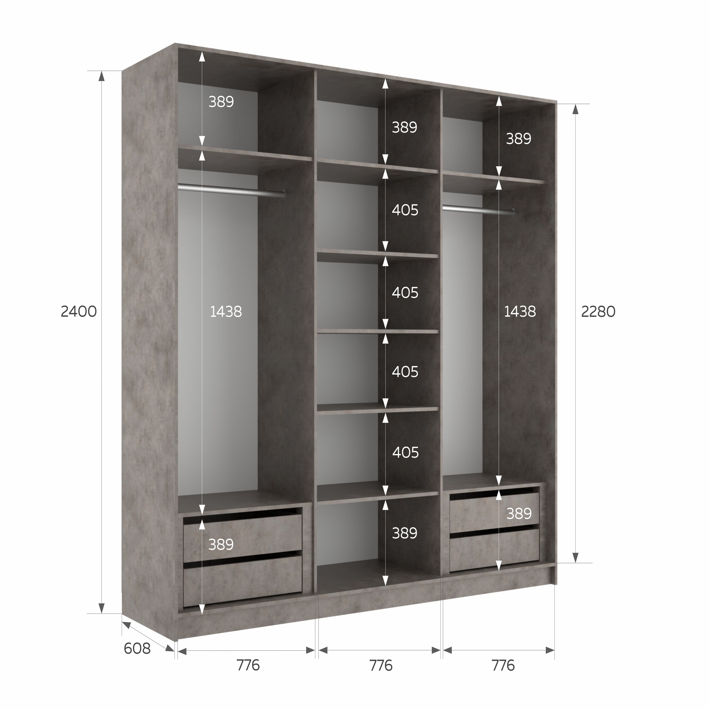 Шкаф-купе Эста Трио Стекло белое 240х66х240 (Бетон серый) Код I0000392402