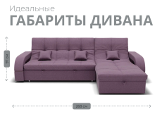 Он имеет высоту 97 см, ширину 268 см и глубину 175 см. Диван обладает универсальным расположением угла, что позволяет его использовать в любом помещении.