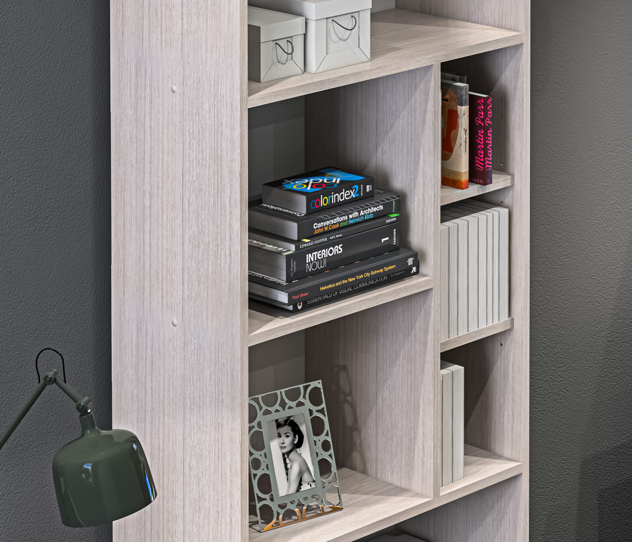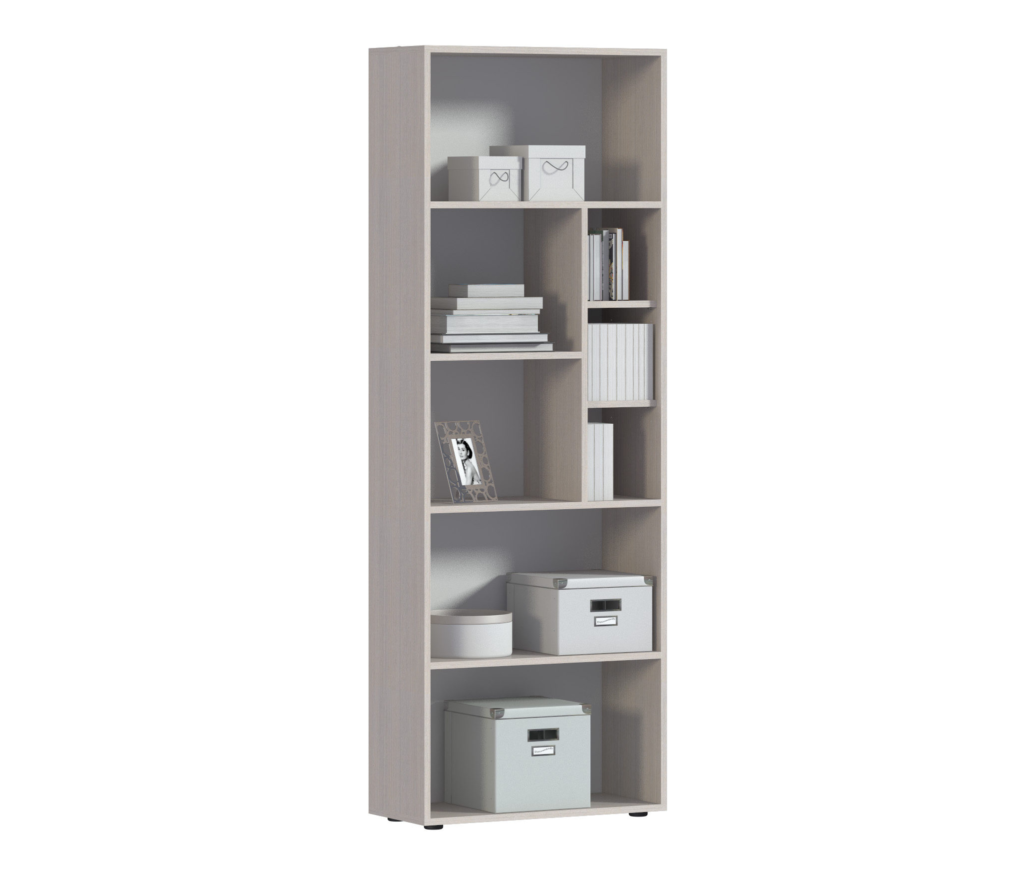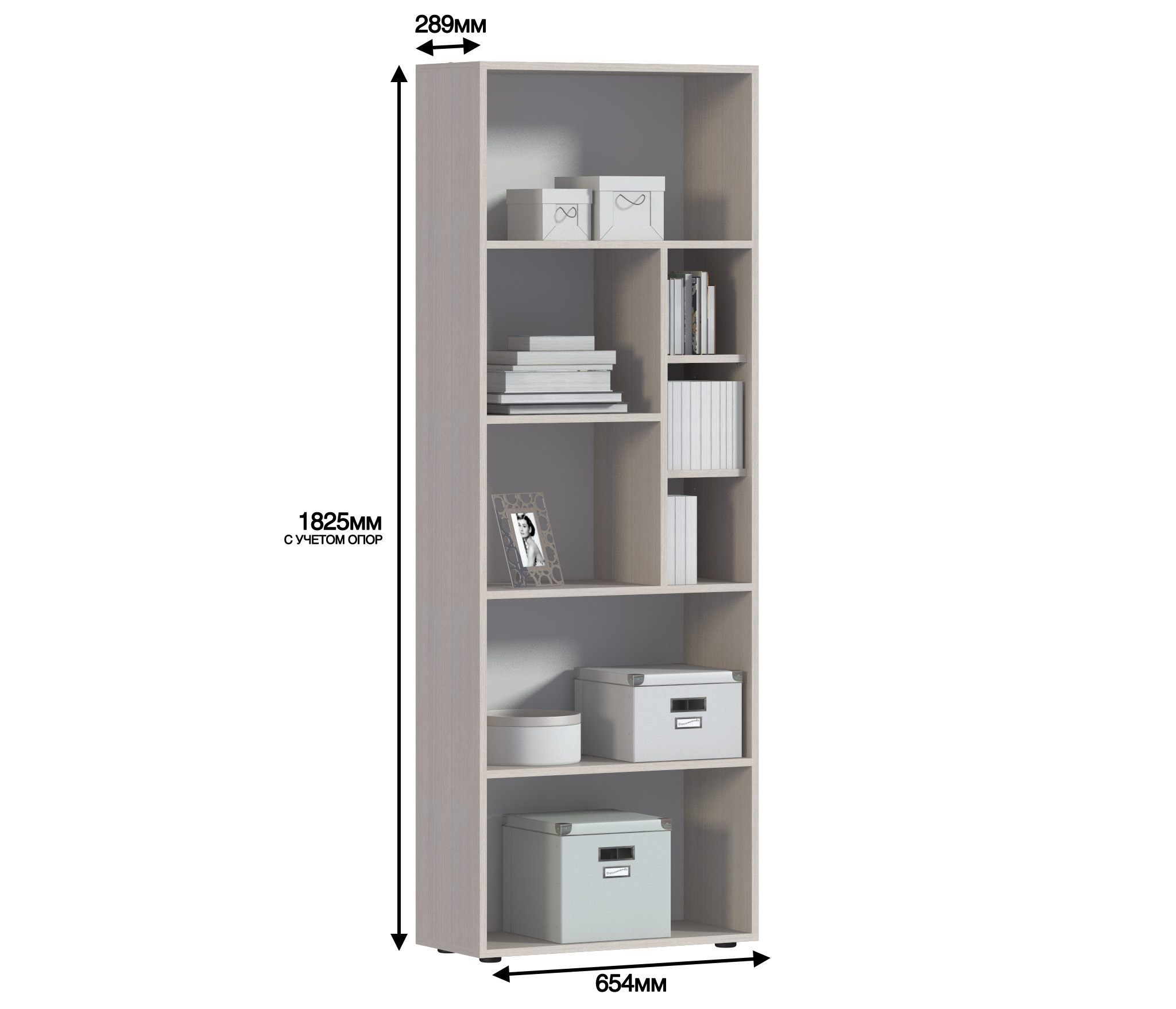 Габаритные размеры – ширина 65 см, высота 182 см и глубина 28 см. Конструкция стеллажа представляет собой ряд открытых полок на пяти уровнях. Две нижних и верхняя полки одинакового размера. Две средних полки поделены на секции.
