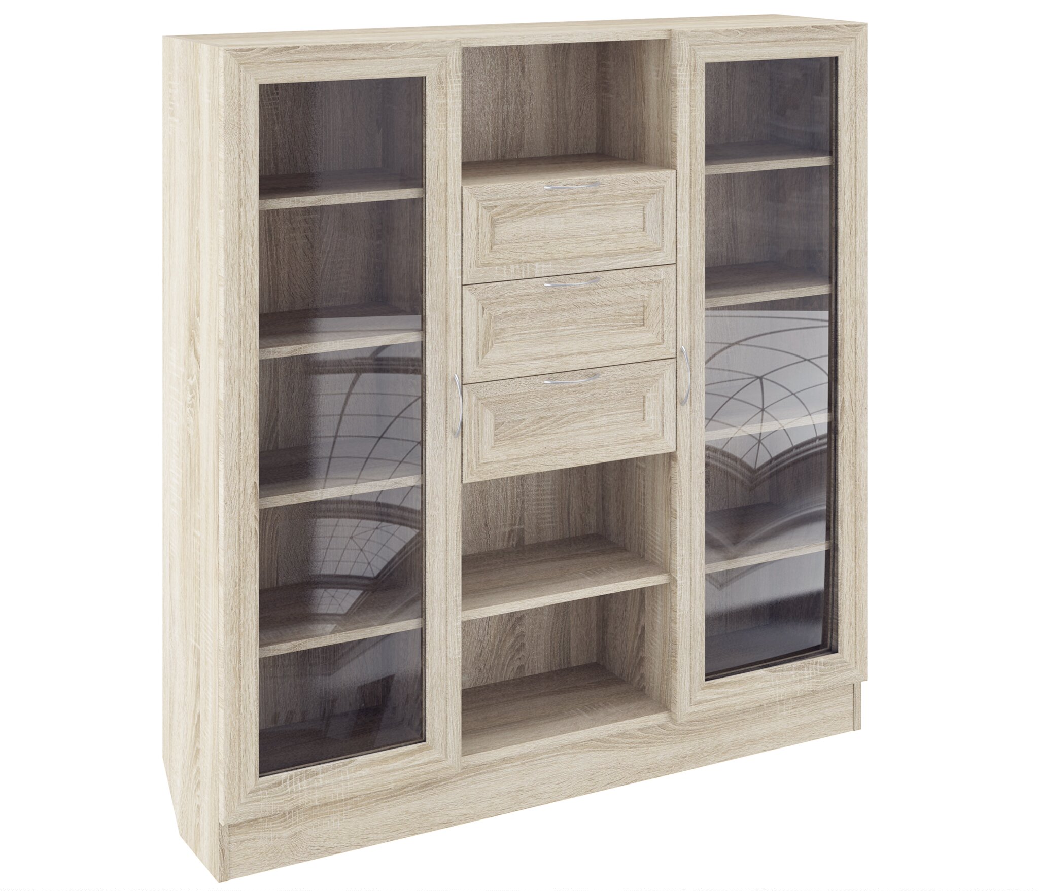 ШК-10 Изделие представляет собой универсальный высокий, книжный комод с застекленными секциями и выкатными ящиками. Корпус выполнен из Ламинированной ДСП высокого качества с насыщенным цветом. Наполнение комода представляет собой три вертикальных секции, средняя секция содержит три открытых ниши и три выкатных ящика. По бокам справа и слева расположены закрытые симметричные секции с распашными дверьми. В каждой такой секции по четыре полки. Фасады выполнены из материала МДФ.