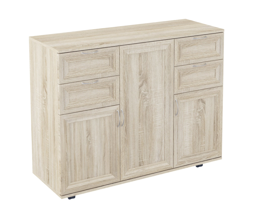 Комод 3 отличается многофункциональностью и большими размерами.оснащён выдвижными ящиками и дверками,скрывающими полки.Ножки из пластика,корпус ЛДСП,фасады рамочные МДФ.