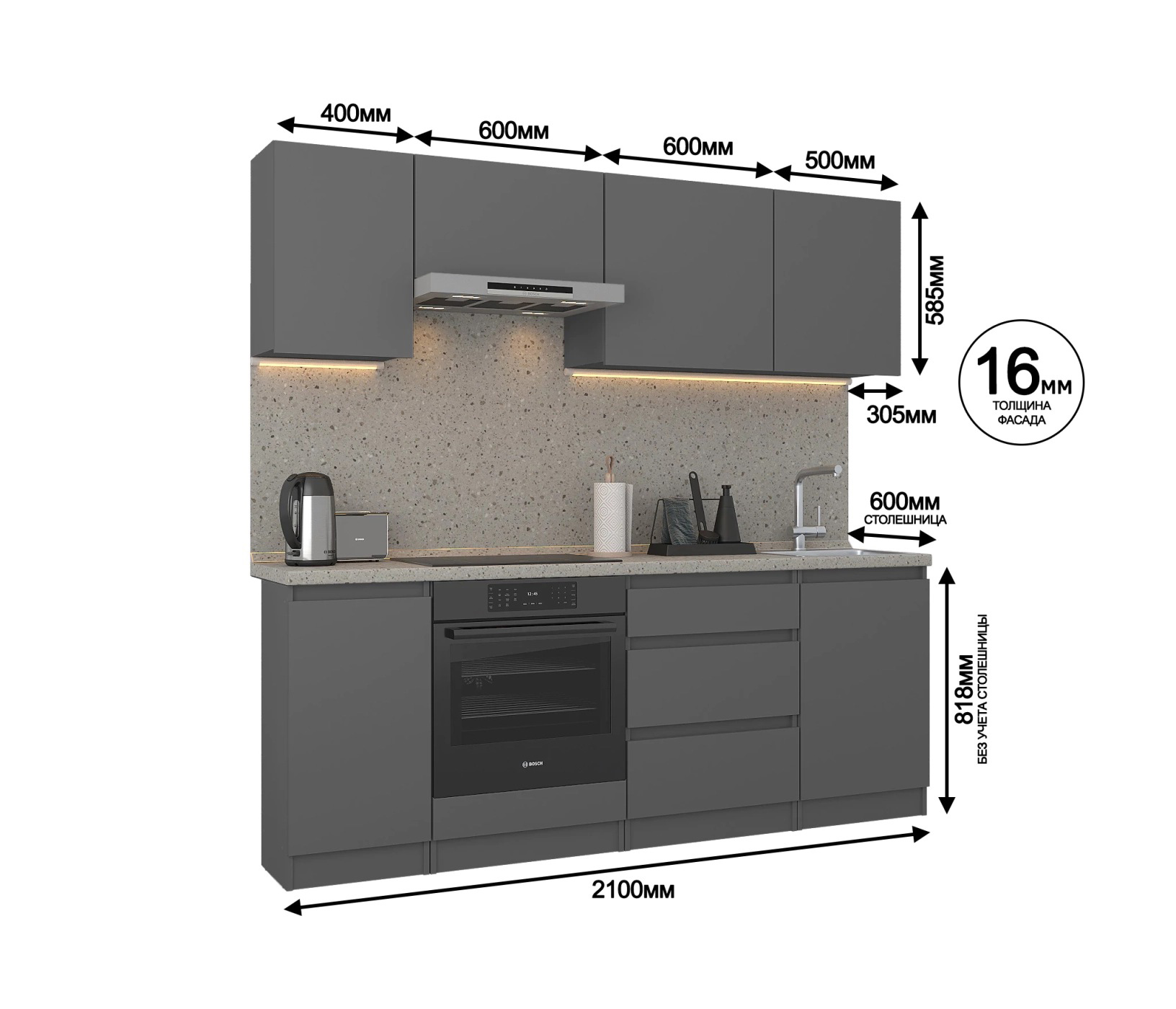Обратите внимание, что столешница, стеновая панель, мойка и смеситель не входят в комплектацию кухни Леон и приобретаются отдельно. Это позволяет вам выбрать идеальные аксессуары и элементы для создания индивидуального дизайна вашей кухни.