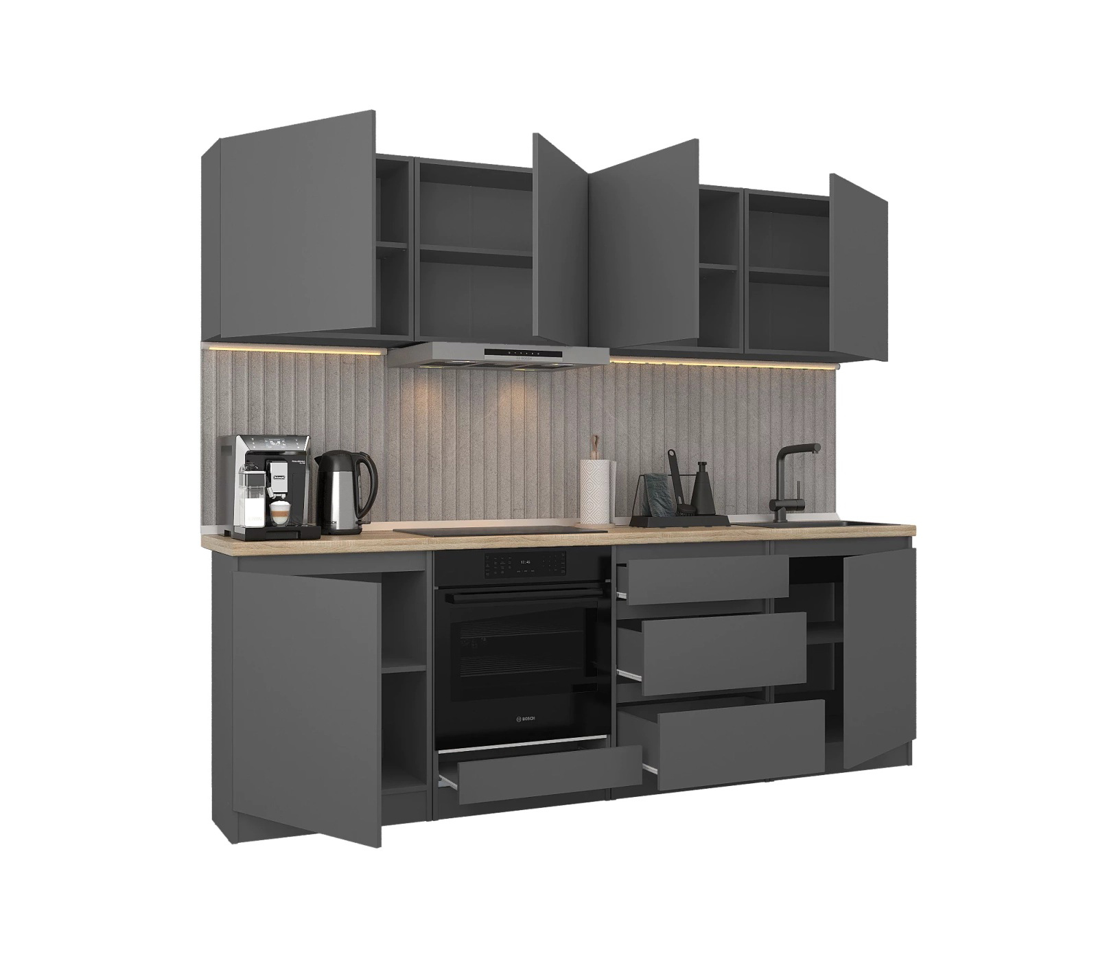 Обратите внимание, что столешница, стеновая панель, мойка и смеситель не входят в комплектацию кухни Леон и приобретаются отдельно. Это позволяет вам выбрать идеальные аксессуары и элементы для создания индивидуального дизайна вашей кухни.