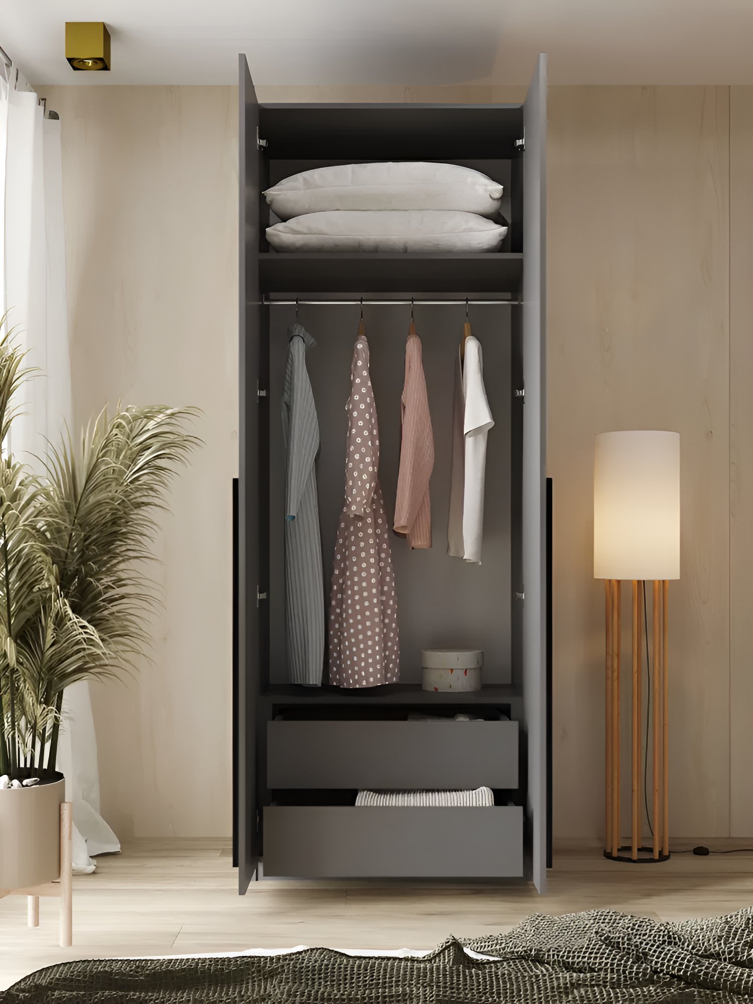 Данный шкаф сочетает в себе практичность и стиль. Удобная конструкция с двумя дверцами обеспечивает легкий доступ к одежде, а встроенные ящики позволяют удобно разместить мелкие предметы, такие как носки, ремни или платки. Благодаря распашному механизму, вам не придется беспокоиться о том, что двери будут мешать при открытии.