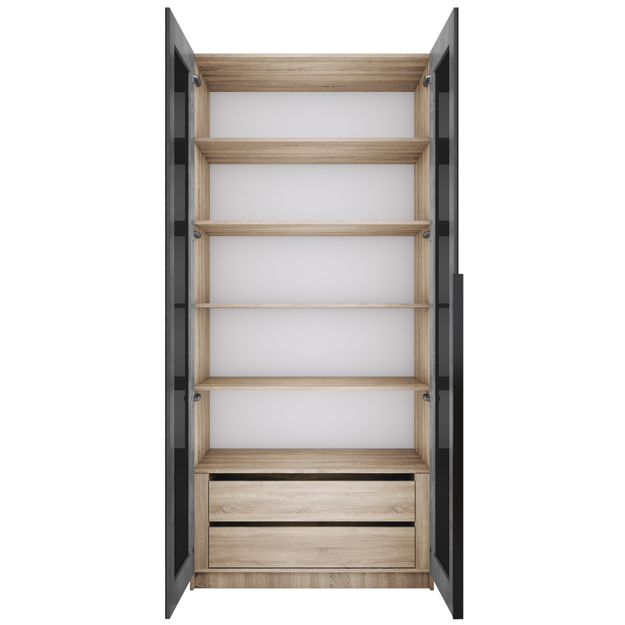 Фасады шкафа изготовлены из стекла черного цвета, оклеенного противоосколочной пленкой с внутренней рамкой из ЛДСП Бетон.