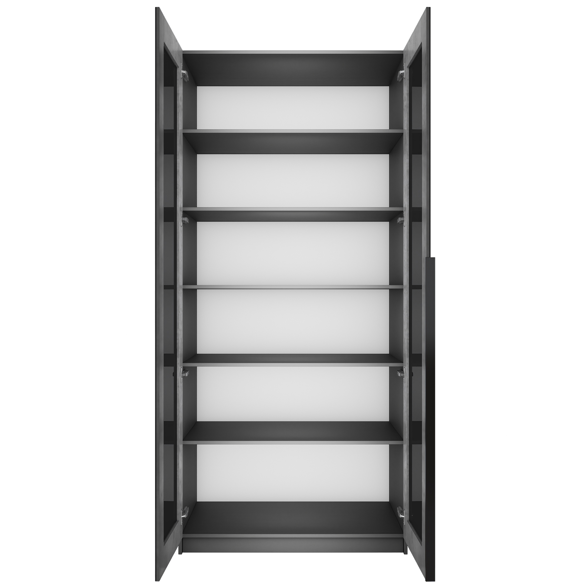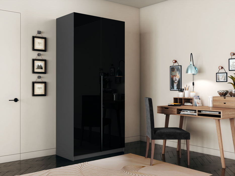 Фасады шкафа изготовлены из стекла черного цвета, оклеенного противоосколочной пленкой с внутренней рамкой из ЛДСП Бетон.