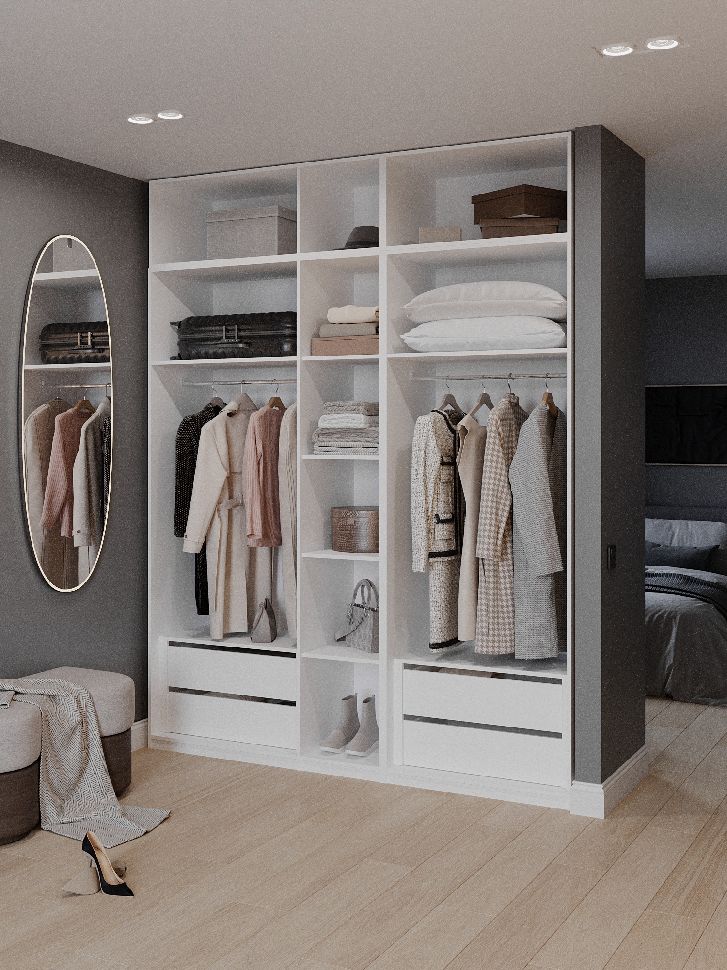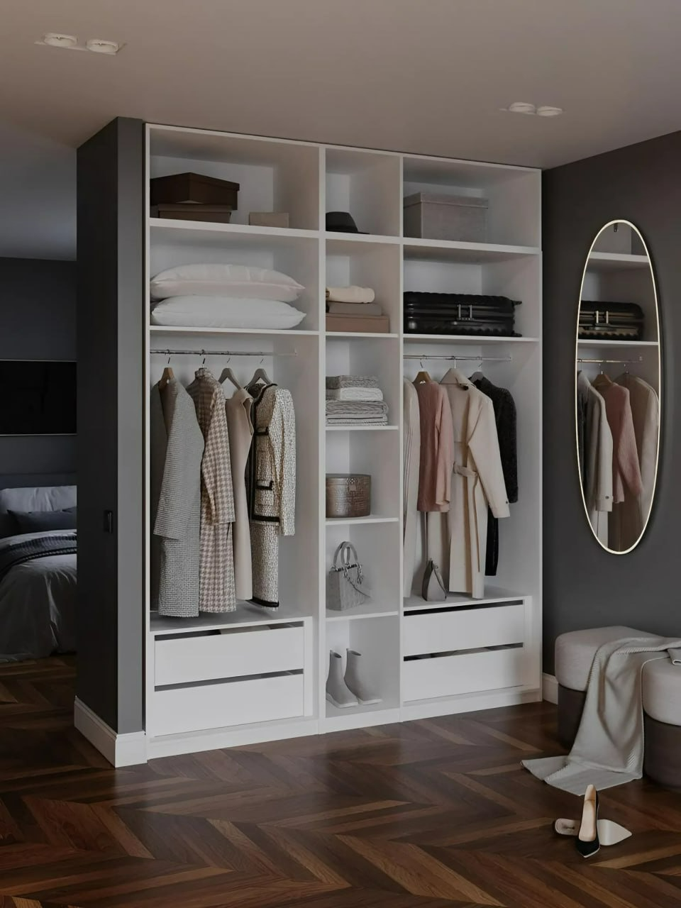 Этот шкаф отличается прочной конструкцией и высоким качеством материалов, что обеспечивает долговечность и надежность в эксплуатации. Он будет прекрасным дополнением к любой гардеробной системе, позволяя создать идеальные условия для хранения всех ваших нарядов. Удобные полки и вешала внутри шкафа помогут оптимально использовать пространство, что особенно важно в современных интерьеров.