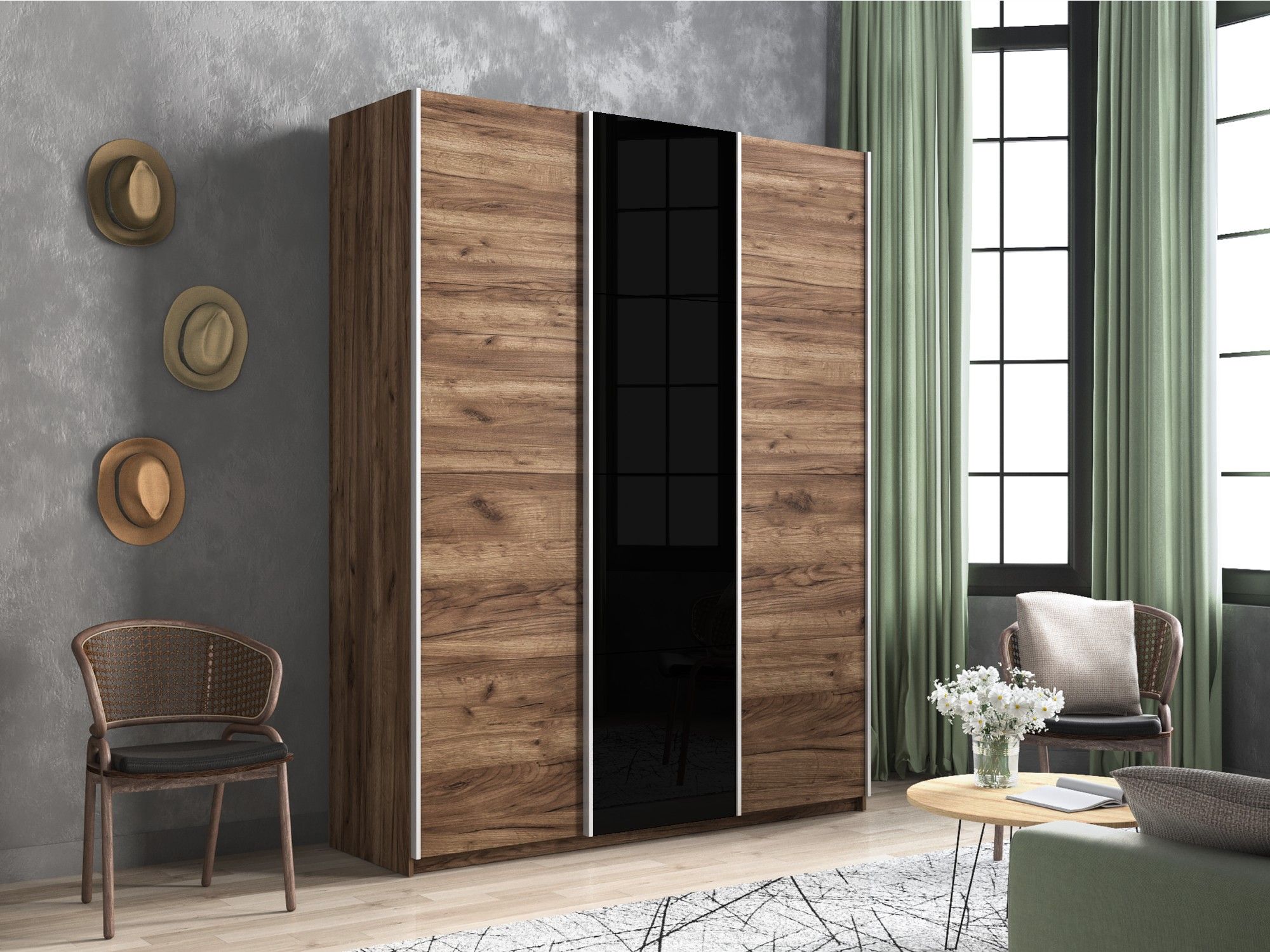 Шкаф-купе Прайм 3-х дверный ДСП/Стекло черное/Доводчики 210х57х230 (Дуб/крафт/табак)