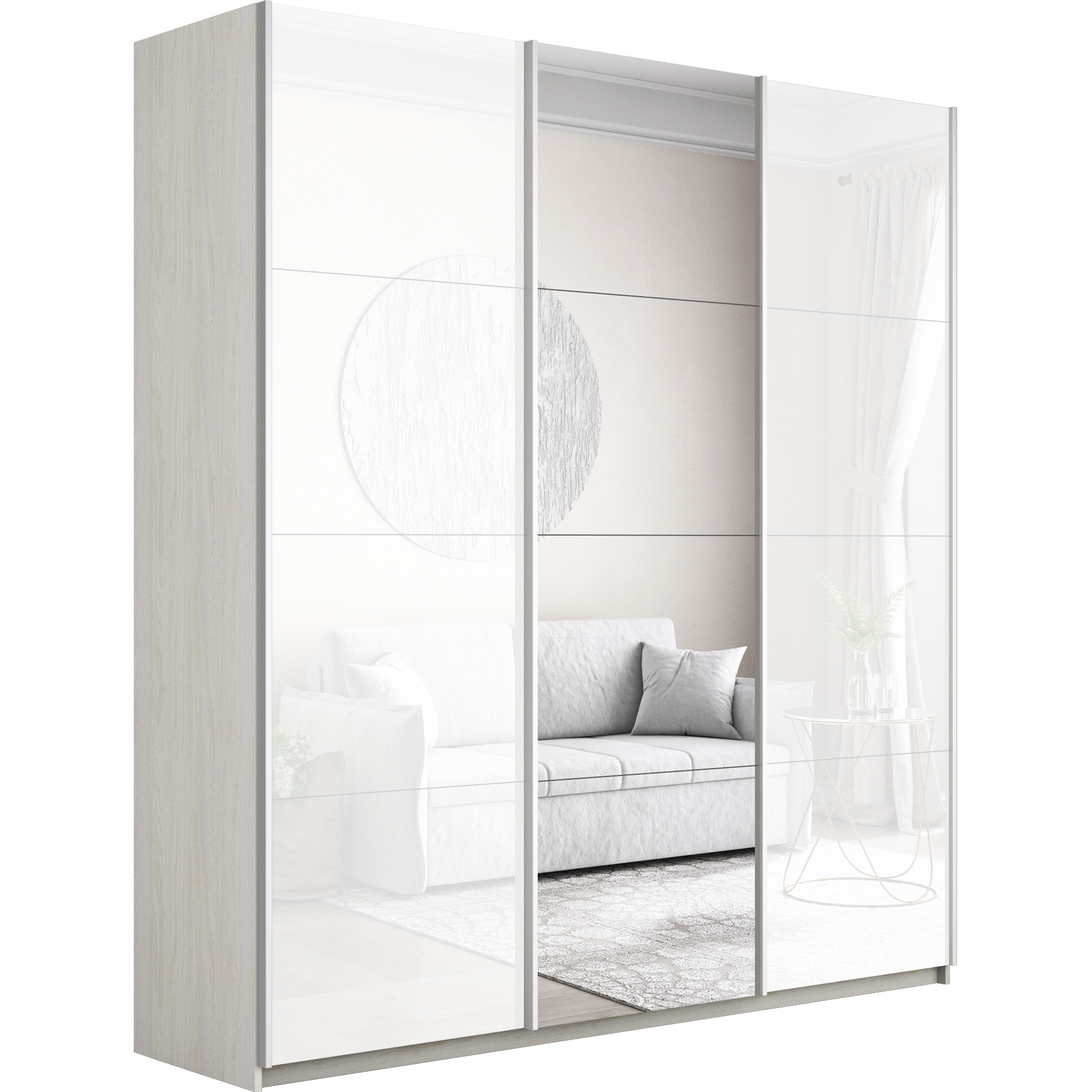 Шкаф-купе Прайм 3-х дверный Стекла белые/Зеркало/Доводчики 210х57х230 (Ясень Анкор светлый)