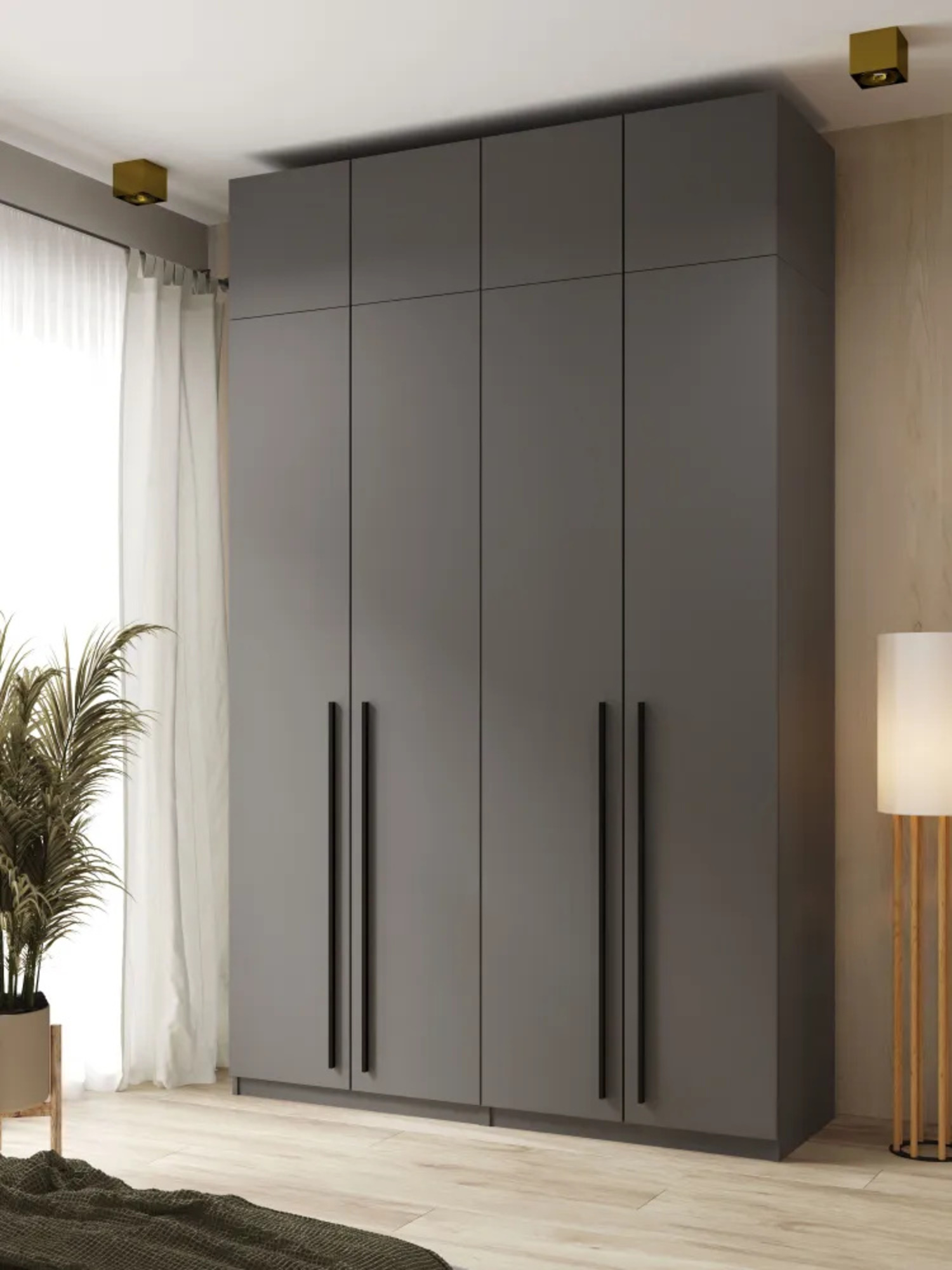 Шкаф оборудован четырьмя дверцами, что обеспечивает удобный доступ к содержимому, а также предоставляет достаточно места для размещения всех необходимых вещей. При этом наличие антресоли создает дополнительные возможности для организации пространства, позволяя хранить вещи, которые не требуются так часто.