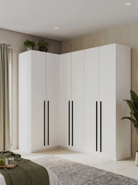 Представляем вашему вниманию угловой шкаф для одежды распашного типа, который станет прекрасным решением для вашего интерьера. Этот белый шкаф не только функционален, но и стильный. Его элегантный дизайн позволит органично вписаться в будь-якую комнату – будь то спальня, прихожая, детская или гостиная.