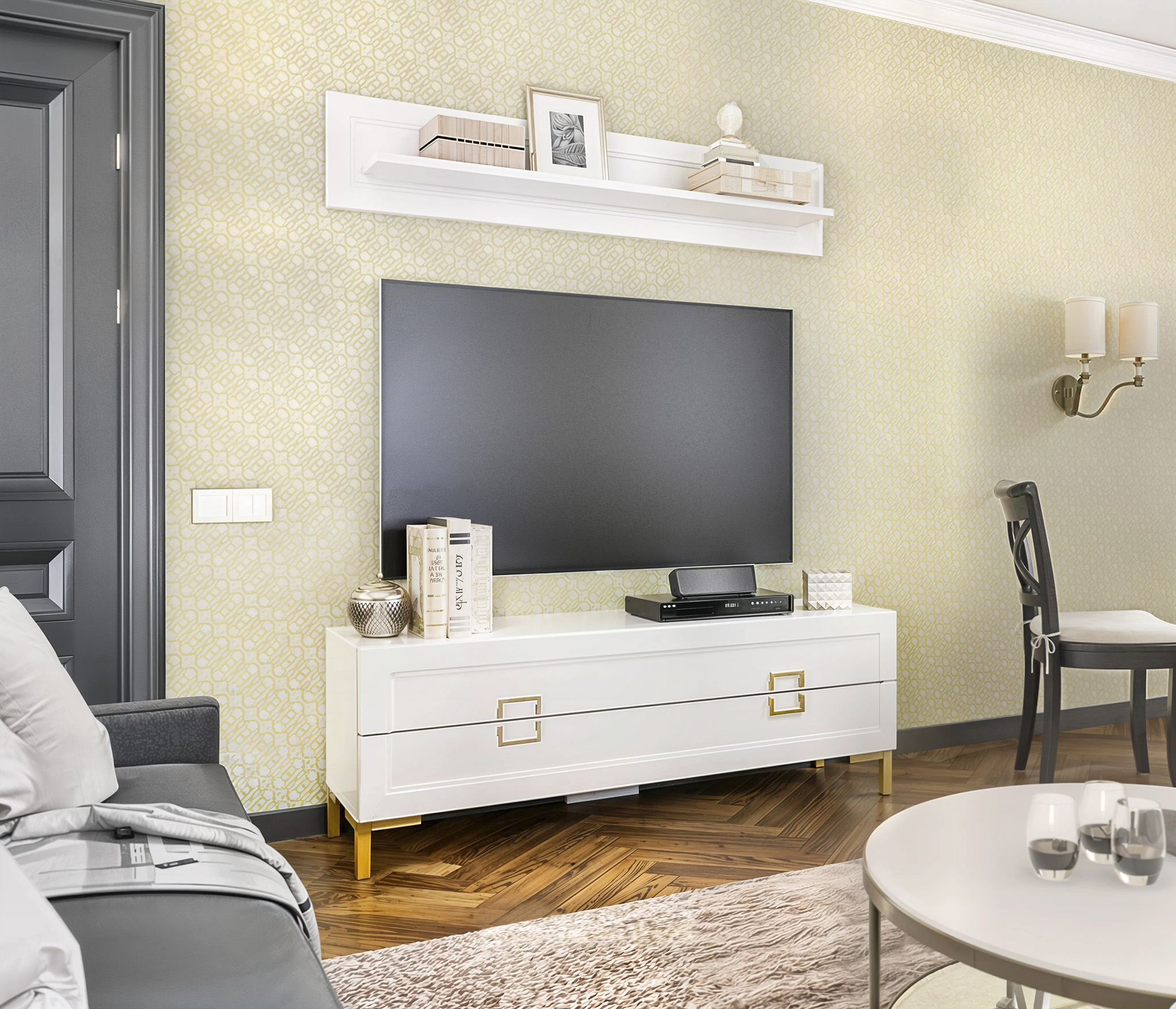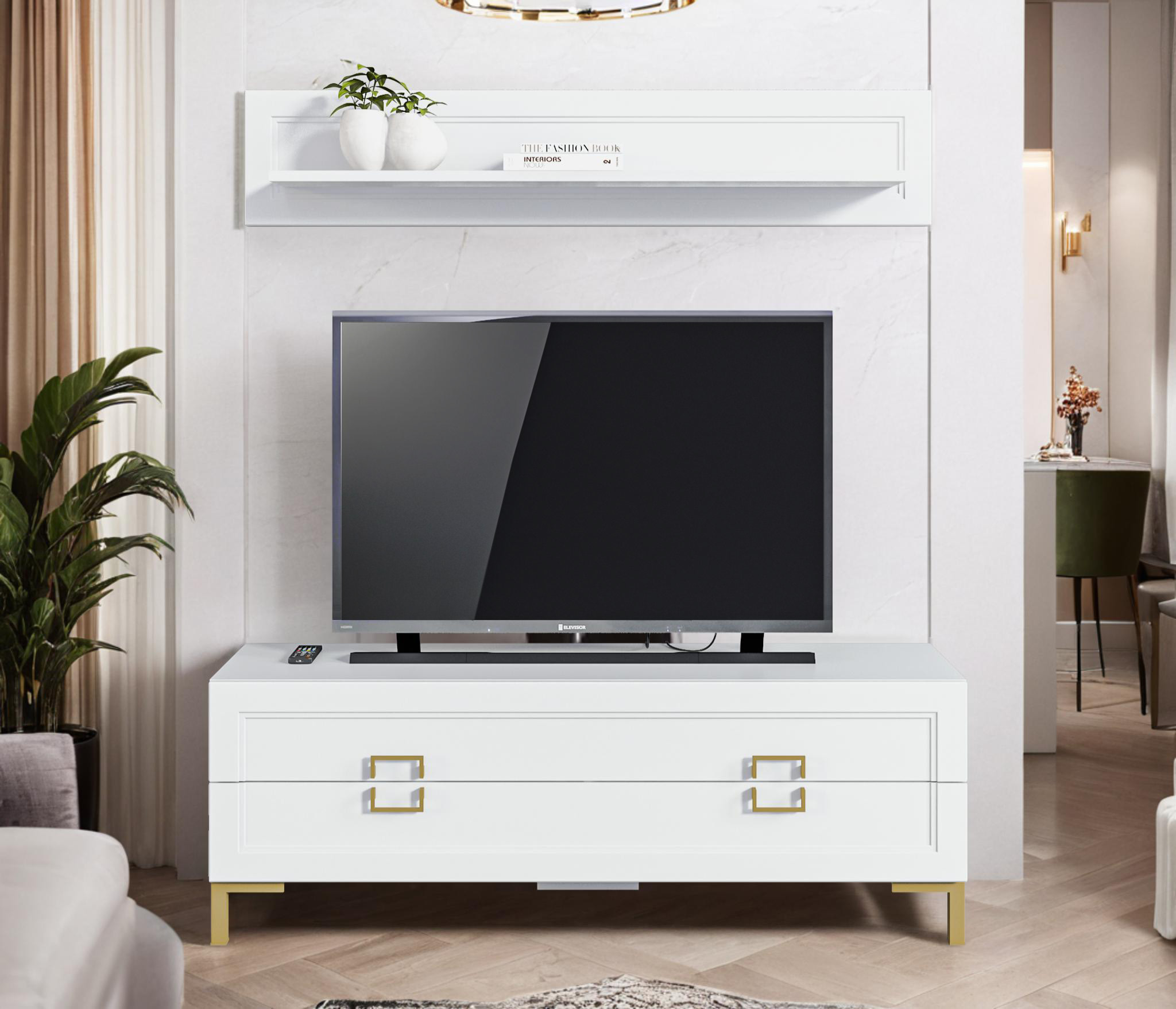 Ассоль СБ-3431 Полка Белый,МДФ БелыйАссоль СБ-3433 Тумба под телевизор Белый/МДФ Белый