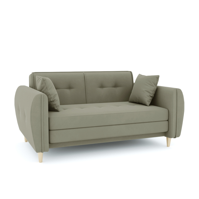 Механизм трансформации еврокнижка трехсекционная. Наполнение высокоэластичный ППУ. Жесткость-средняя. Чехол подушки несъемный, наполнение подушки-крошка ППУ. Спальное место полностью в основной ткани. Каркас-ДСП, ДВП, ЛДСП, фанера, брус хвойных пород. Спальное место 1980х1350 Опоры массив березы. Высота опоры 100мм. Глубина сиденья 600мм. Высота сиденья 440мм. Есть небольшой ящик для белья. В комплекте 2 подушки.