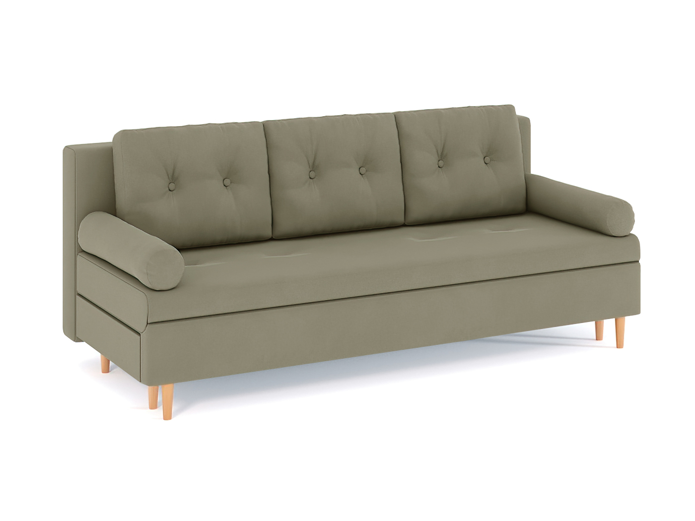 Механизм трансформации-еврокнижка. Наполнение высокоэластичный ППУ. Жесткость-средняя. Чехол подушек несъемный, наполнение-крошка ППУ. Каркас ДСП, ДВП, ЛДСП, фанера, брус хвойных пород. Спальное место 1950х1440. Ящик для белья есть. Опоры массив березы. Высота опоры 150мм. Высота сиденья 440мм. Глубина сиденья без подушек 760мм. В комплекте 3 большие подушки и 2 подушка/валика.