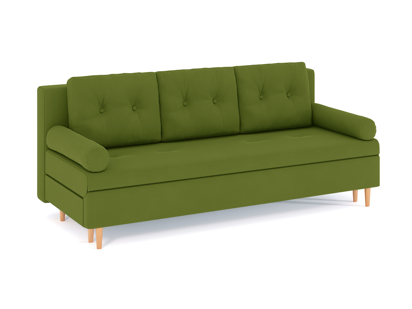 Механизм трансформации-еврокнижка. Наполнение высокоэластичный ППУ. Жесткость-средняя. Чехол подушек несъемный, наполнение-крошка ППУ. Каркас ДСП, ДВП, ЛДСП, фанера, брус хвойных пород. Спальное место 1950х1440. Ящик для белья есть. Опоры массив березы. Высота опоры 150мм. Высота сиденья 440мм. Глубина сиденья без подушек 760мм. В комплекте 3 большие подушки и 2 подушка/валика.