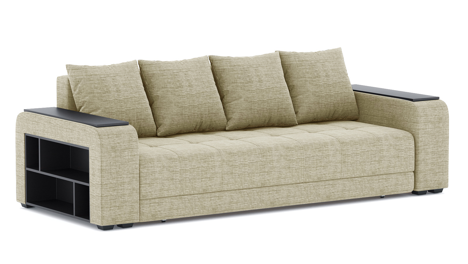Механизм трансформации еврокнижка-пантограф. Наполнение пружинный блок+ высокоэластичный ППУ. Жесткость-средняя. Чехлы подушек несъемные, наполнение-крошка ППУ. Каркас ДСП, ДВП, ЛДСП, фанера, брус хвойных пород. Спальное место 1900х1600. Ящик для белья есть. Высота сиденья 430мм. Глубина сиденья без подушек 880мм. В комплекте 4 большие подушки.