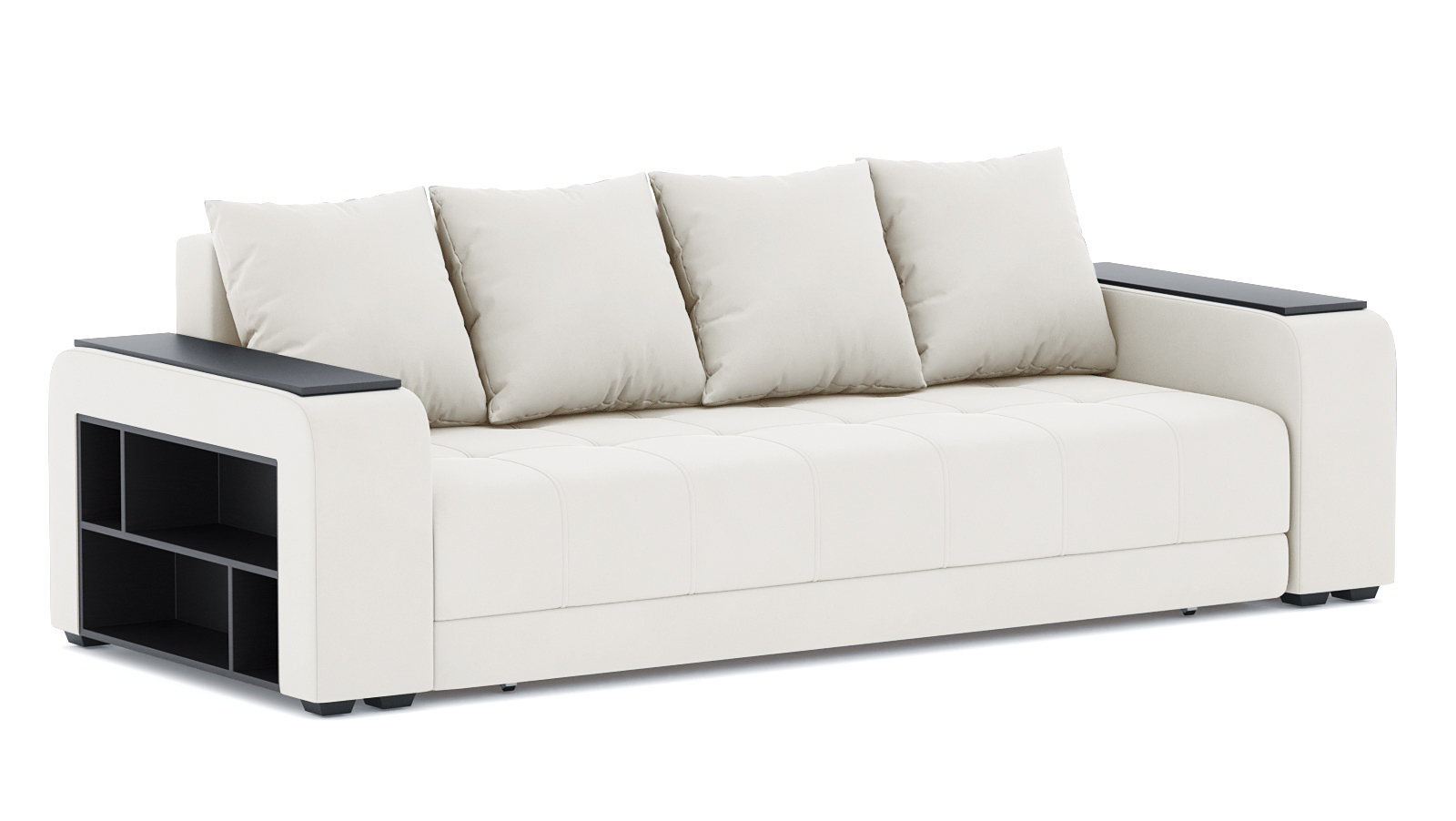 Механизм трансформации еврокнижка-пантограф. Наполнение пружинный блок+ высокоэластичный ППУ. Жесткость-средняя. Чехлы подушек несъемные, наполнение-крошка ППУ. Каркас ДСП, ДВП, ЛДСП, фанера, брус хвойных пород. Спальное место 1900х1600. Ящик для белья есть. Высота сиденья 430мм. Глубина сиденья без подушек 880мм. В комплекте 4 большие подушки.