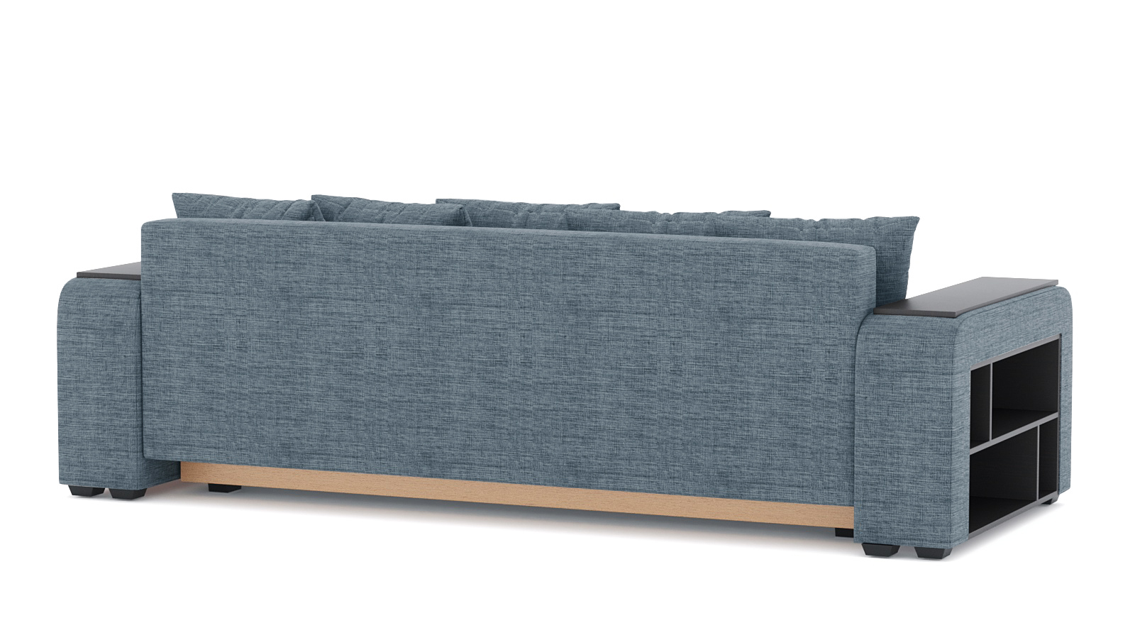 Механизм трансформации-еврокнижка. Наполнение пружинный блок+высокоэластичный ППУ. Каркас ДСП, ДВП, ЛДСП, фанера, брус хвойных пород. Полка ЛДСП только в одном подлокотнике. Ящик для белья-есть. Чехлы подушек-несъемные, наполнение крошка ППУ. Спальное место 2000х1600. Высота сиденья 430мм. Глубина сиденья без подушек 880мм. В комплекте 5 больших подушек и 2 декоративные.