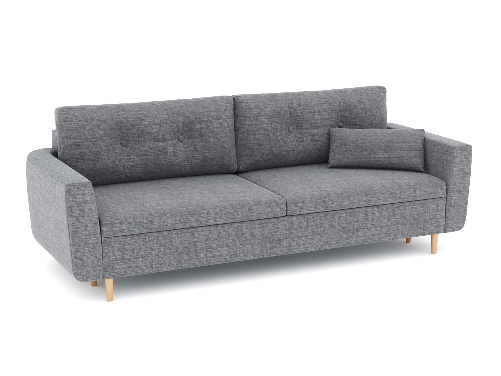 Механизм трансформации еврокнижка-пантограф. Наполнение высокоэластичный ППУ. Жесткость-средняя. Чехлы больших подушек несъемные, наполнение-крошка ППУ. Каркас ДСП, ДВП, ЛДСП, фанера, брус хвойных пород. Спальное место 1950х1440. Ящик для белья есть. Глубина сиденья без подушек 760мм. Высота сиденья 42мм. В комплекте 2 большие подушки и 1 декоративная. Опора-массив березы, высота 150мм.