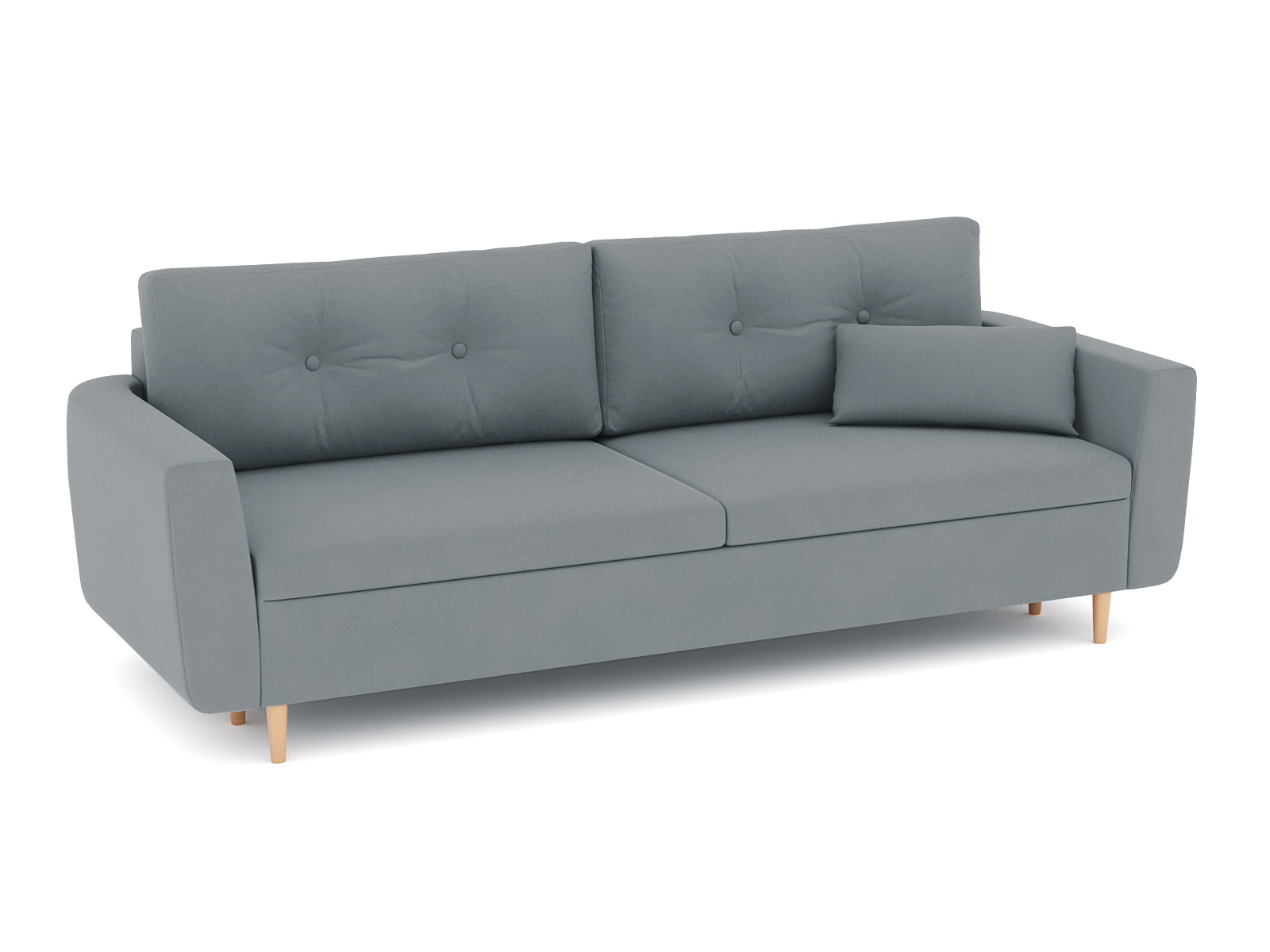 Механизм трансформации еврокнижка-пантограф. Наполнение высокоэластичный ППУ. Жесткость-средняя. Чехлы больших подушек несъемные, наполнение-крошка ППУ. Каркас ДСП, ДВП, ЛДСП, фанера, брус хвойных пород. Спальное место 1950х1440. Ящик для белья есть. Глубина сиденья без подушек 760мм. Высота сиденья 42мм. В комплекте 2 большие подушки и 1 декоративная. Опора-массив березы, высота 150мм.