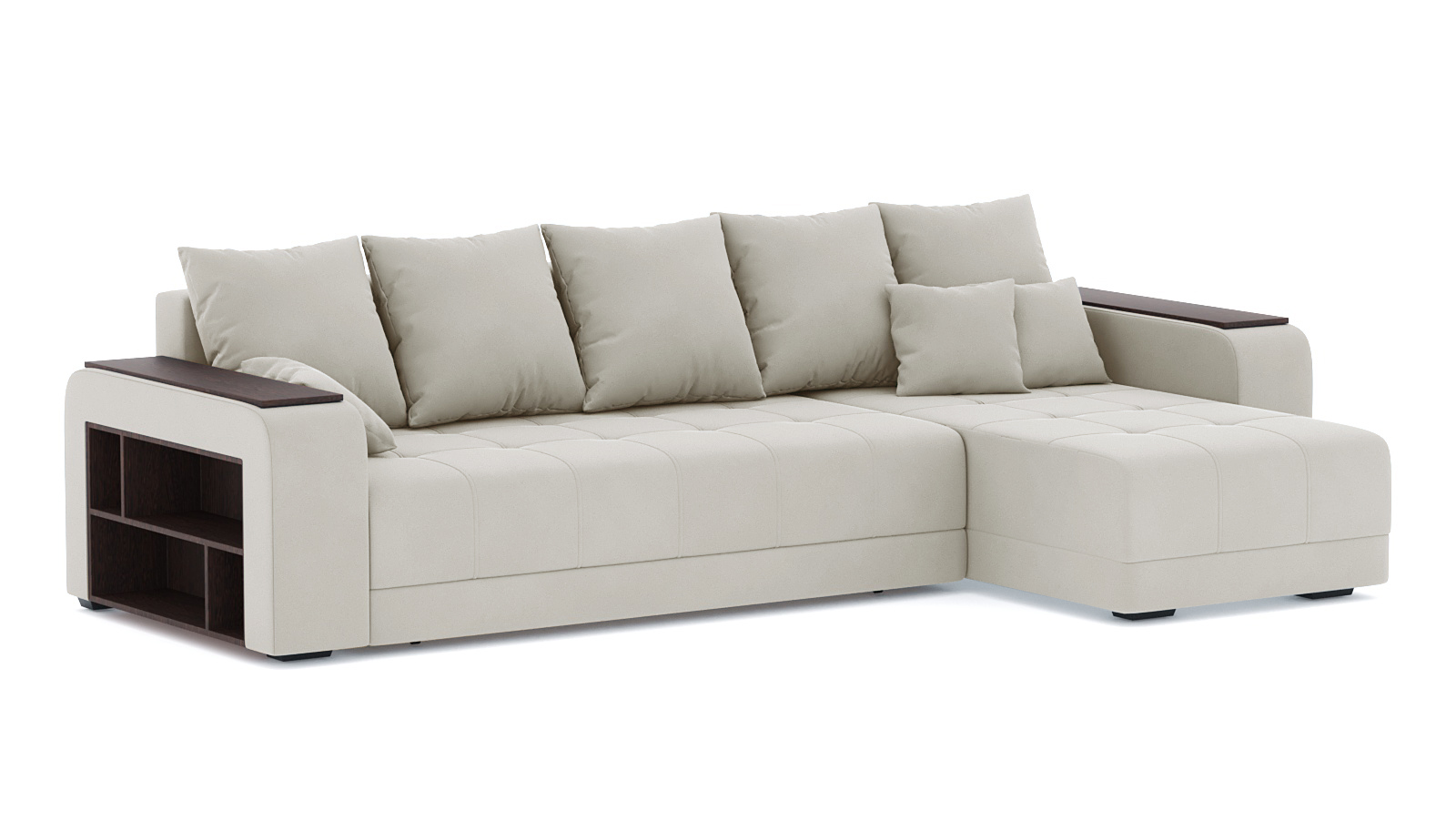 Механизм трансформации еврокнижка. Наполнение пружинный блок+высокоэластичный ППУ. Спальное место 2400х1600. Ящик для белья есть. Глубина сиденья без подушек 900мм. Высота сиденья 430мм. Чехлы подушек несъёмные, наполнение крошка ППУ. В комплекте 5 больших подушкек и 3 декоративные. Угол дивана универсальный, подлокотники взаимозаменяемые.