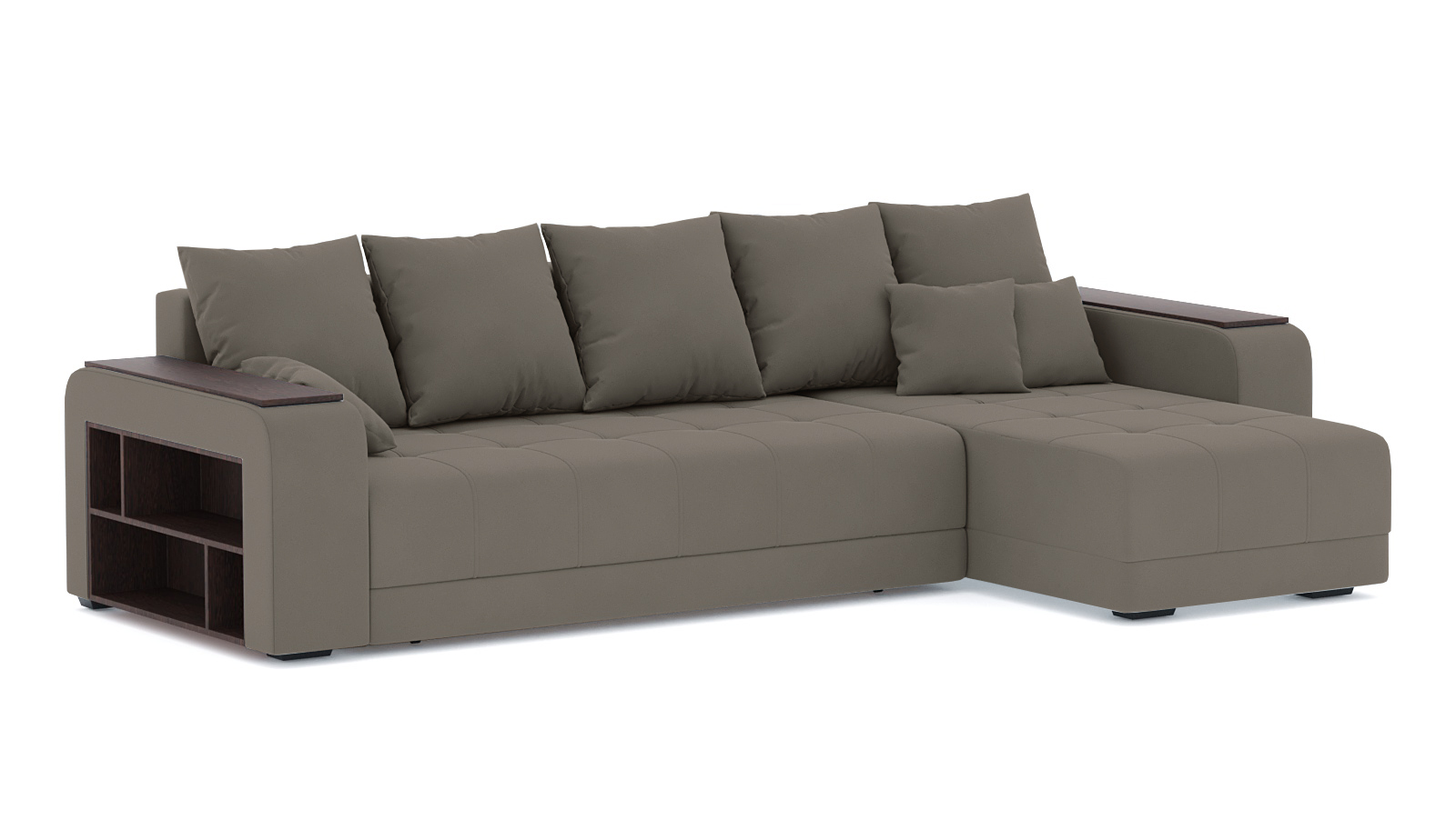 Механизм трансформации еврокнижка. Наполнение пружинный блок+высокоэластичный ППУ. Спальное место 2400х1600. Ящик для белья есть. Глубина сиденья без подушек 900мм. Высота сиденья 430мм. Чехлы подушек несъёмные, наполнение крошка ППУ. В комплекте 5 больших подушкек и 3 декоративные. Угол дивана универсальный, подлокотники взаимозаменяемые.