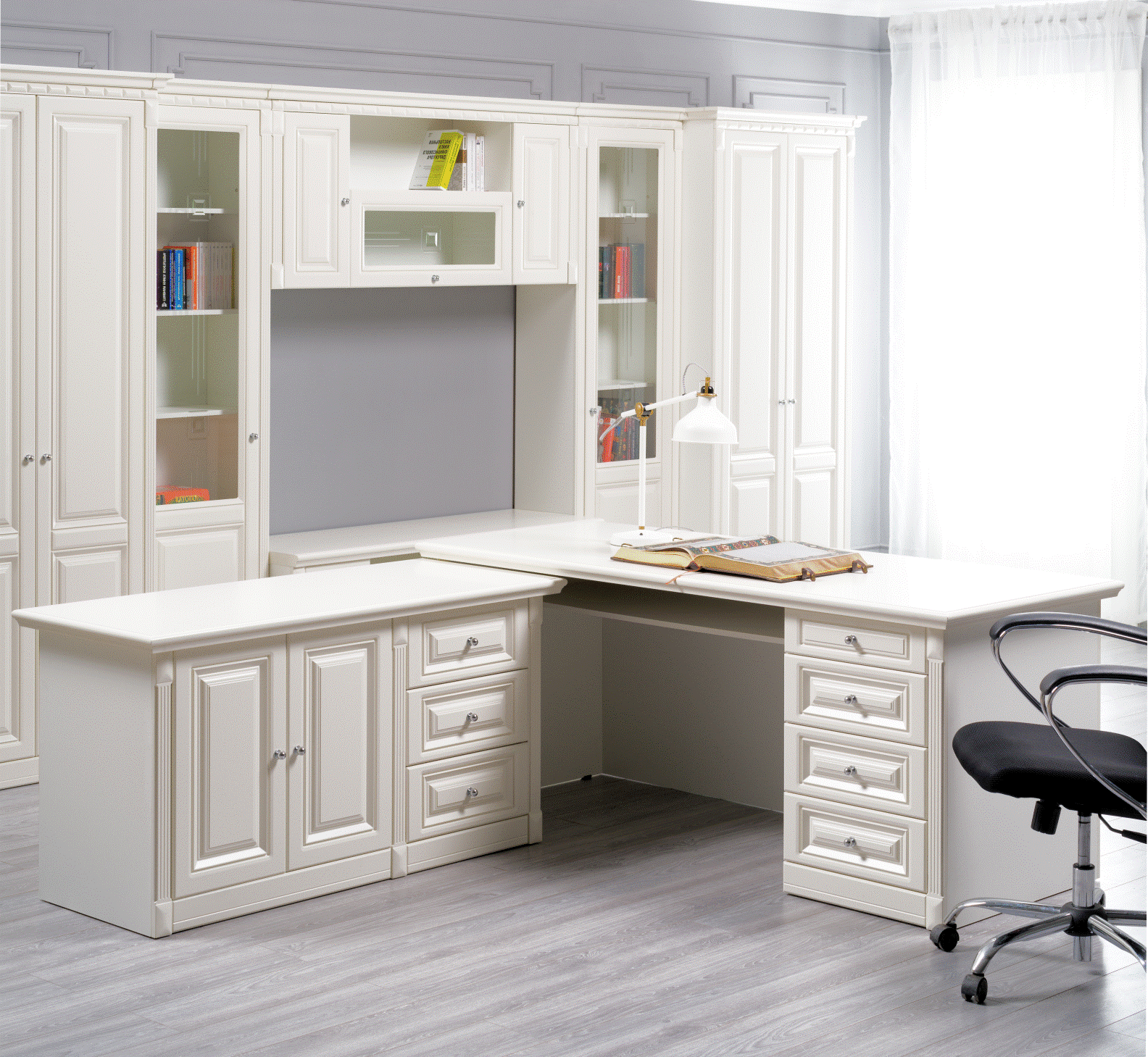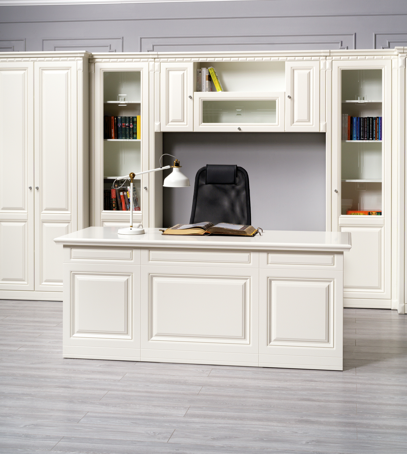 Мебель выполнена из МДФ с 3D-фрезеровкой, его отличают высокая прочность и долговечность, экологичность и безопасность. Две вариации шкафов – с глухим и стеклянным фасадом позволят как разместить книги, сувениры, так и скрыть то, что необходимо от посторонних глаз.