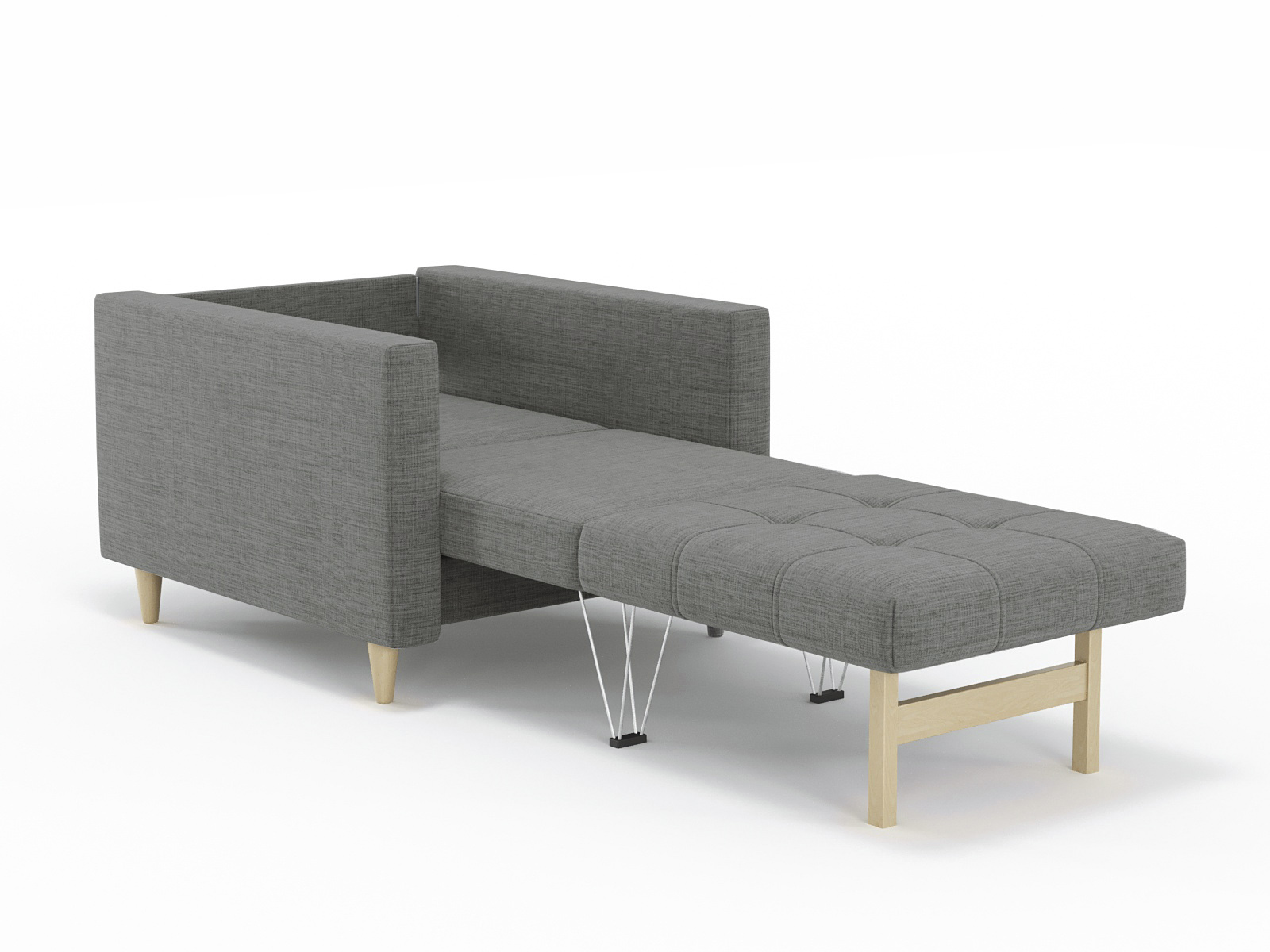 Кресло-кровать для отдыха. Каркас ДСП, ДВП, ЛДСП, фанера, брус хвойных пород. Спасльное место 1900х610. Наполнение высокоэластичный ППУ. Наполнение подушки-крошка ППУ. Высота сиденья от пола 440мм. Глубина сиденья 580мм. Опора массив березы, высота опоры 100мм.