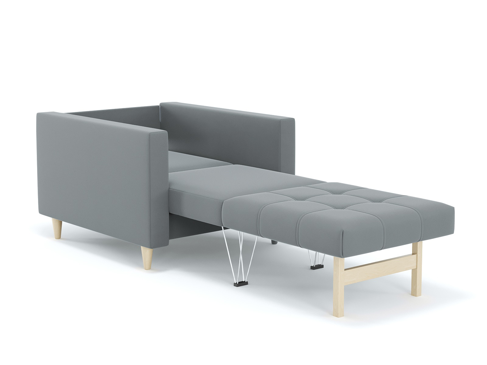 Кресло-кровать для отдыха. Каркас ДСП, ДВП, ЛДСП, фанера, брус хвойных пород. Спасльное место 1900х610. Наполнение высокоэластичный ППУ. Наполнение подушки-крошка ППУ. Высота сиденья от пола 440мм. Глубина сиденья 580мм. Опора массив березы, высота опоры 100мм.