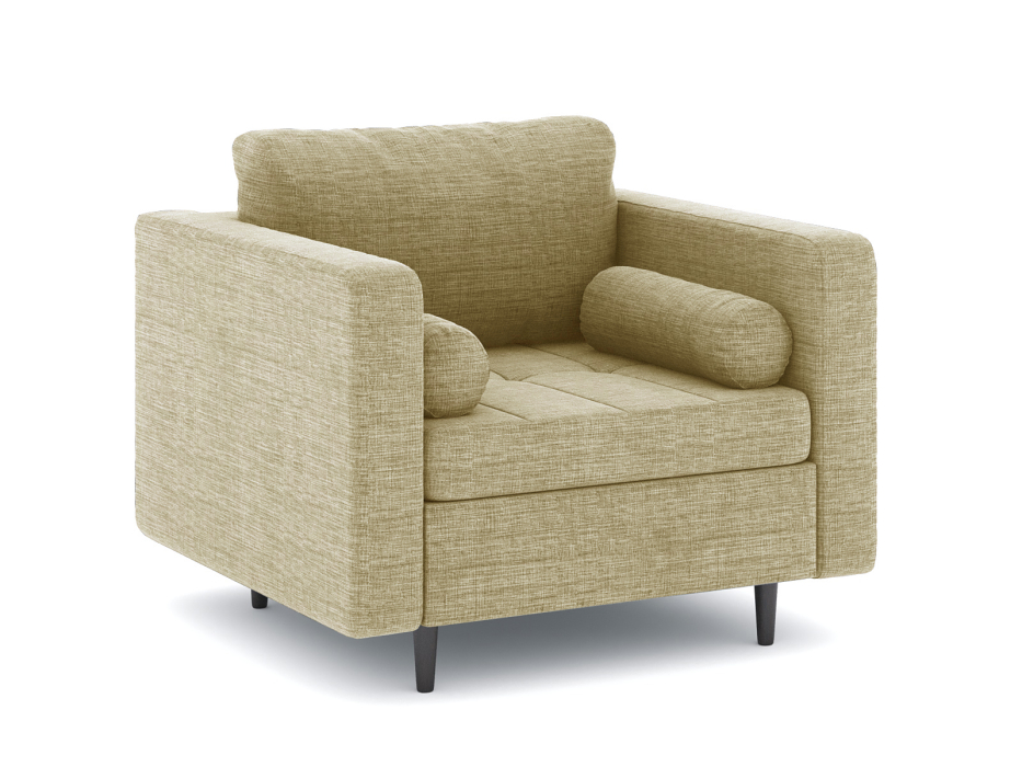 Кресло для отдыха. Каркас ДСП, ДВП, ЛДСП, фанера, брус хвойных пород. Наполнение высокоэластичный ППУ. Наполнение подушки-крошка ППУ. Высота сиденья от пола 420мм. Глубина сиденья без подушки 880мм. Опора массив березы, высота опоры 150мм.