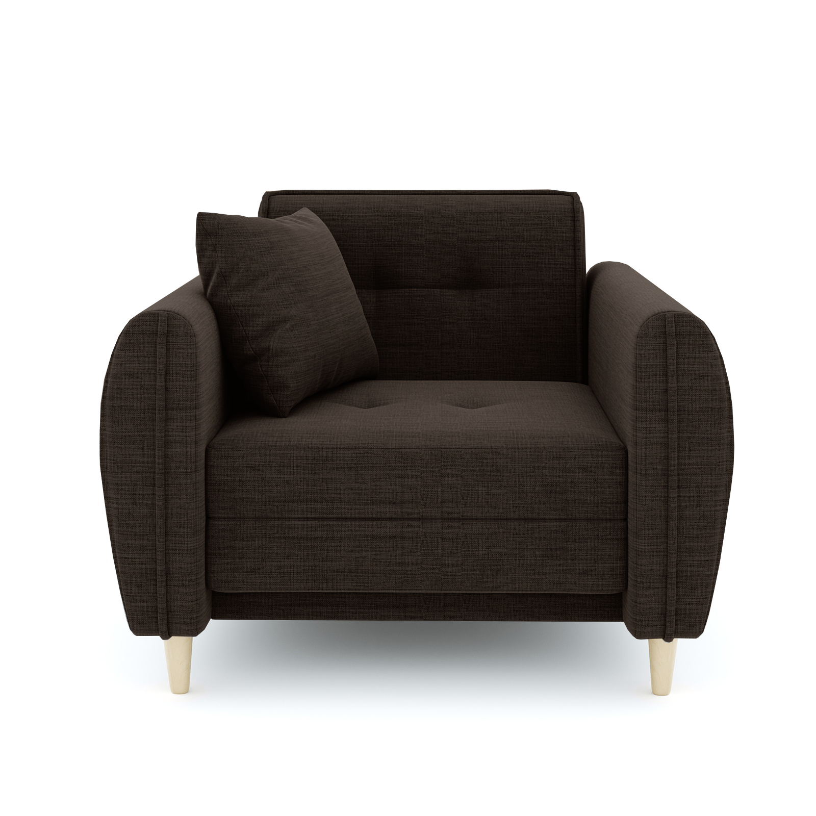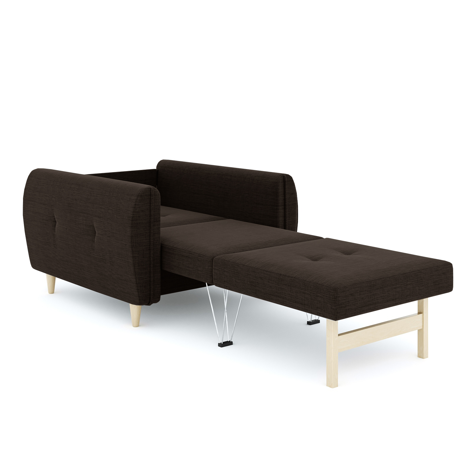 Кресло-кровать для отдыха. Каркас ДСП, ДВП, ЛДСП, фанера, брус хвойных пород. Спальное место 1900х600мм. Наполнение высокоэластичный ППУ. Наполнение подушки-крошка ППУ. Высота сиденья от пола 440мм. Глубина сиденья без подушки 600мм. Опора массив березы. Высота опоры 100мм.