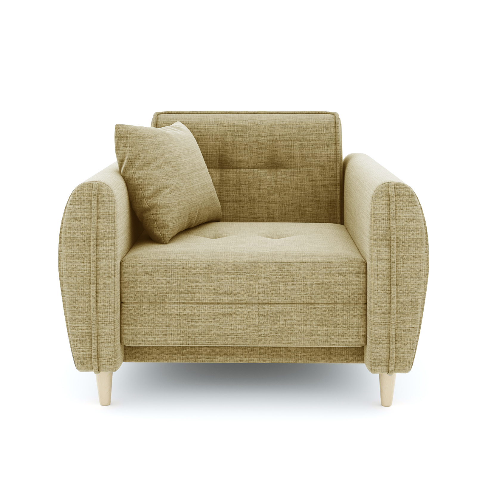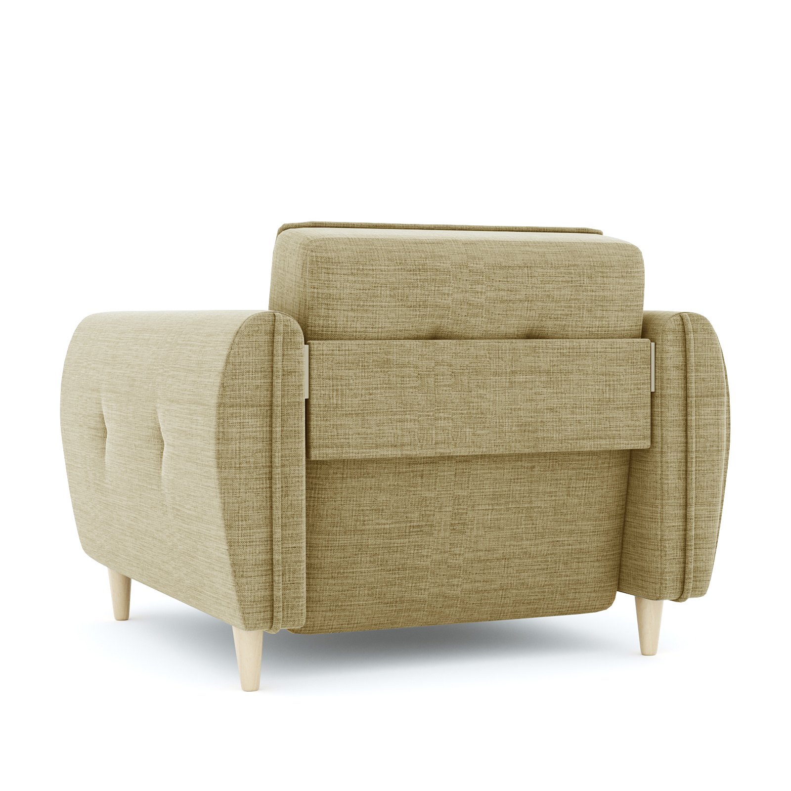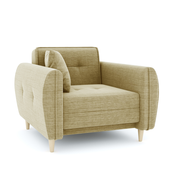Кресло-кровать для отдыха. Каркас ДСП, ДВП, ЛДСП, фанера, брус хвойных пород. Спальное место 1900х600мм. Наполнение высокоэластичный ППУ. Наполнение подушки-крошка ППУ. Высота сиденья от пола 440мм. Глубина сиденья без подушки 600мм. Опора массив березы. Высота опоры 100мм.