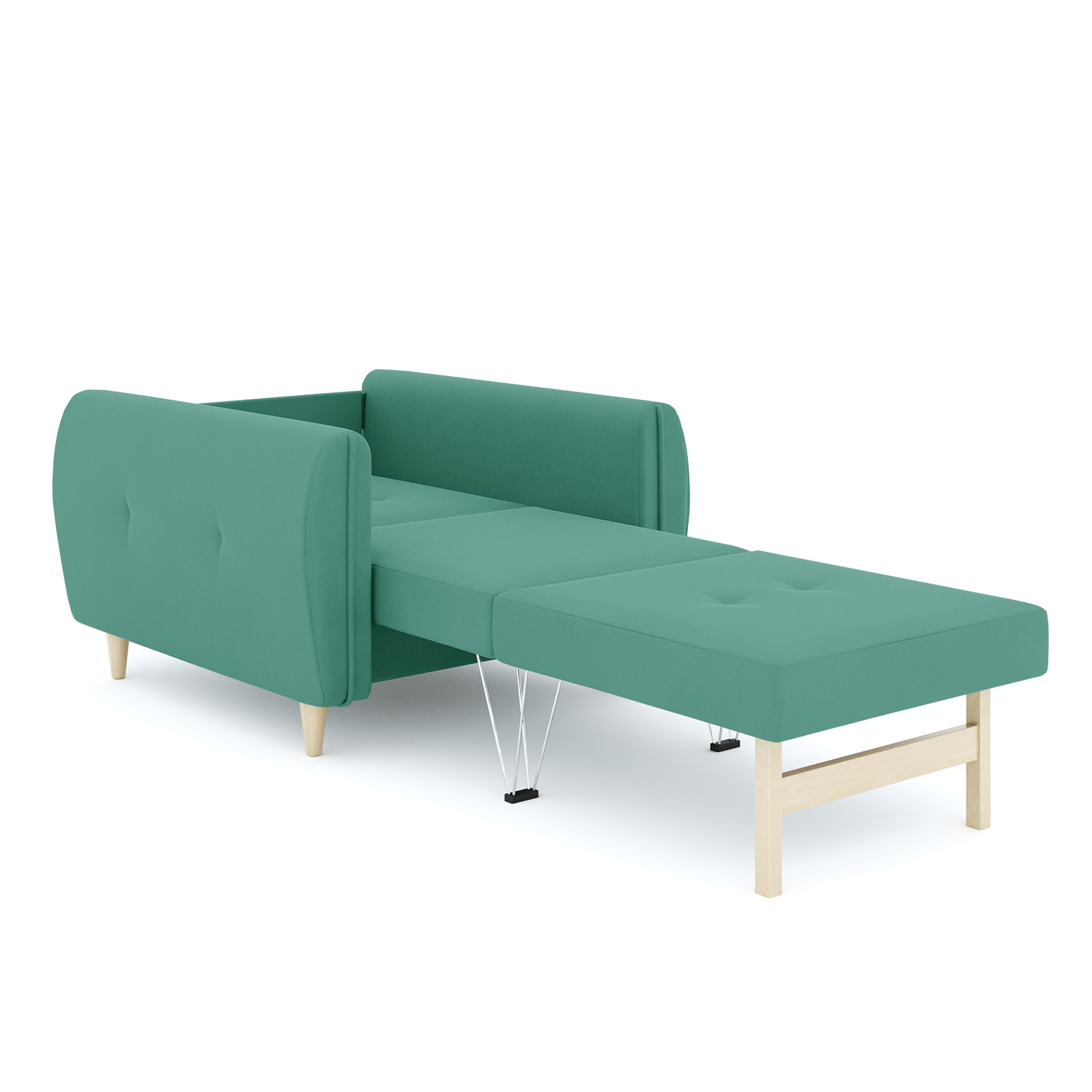Кресло-кровать для отдыха. Каркас ДСП, ДВП, ЛДСП, фанера, брус хвойных пород. Спальное место 1900х600мм. Наполнение высокоэластичный ППУ. Наполнение подушки-крошка ППУ. Высота сиденья от пола 440мм. Глубина сиденья без подушки 600мм. Опора массив березы. Высота опоры 100мм.