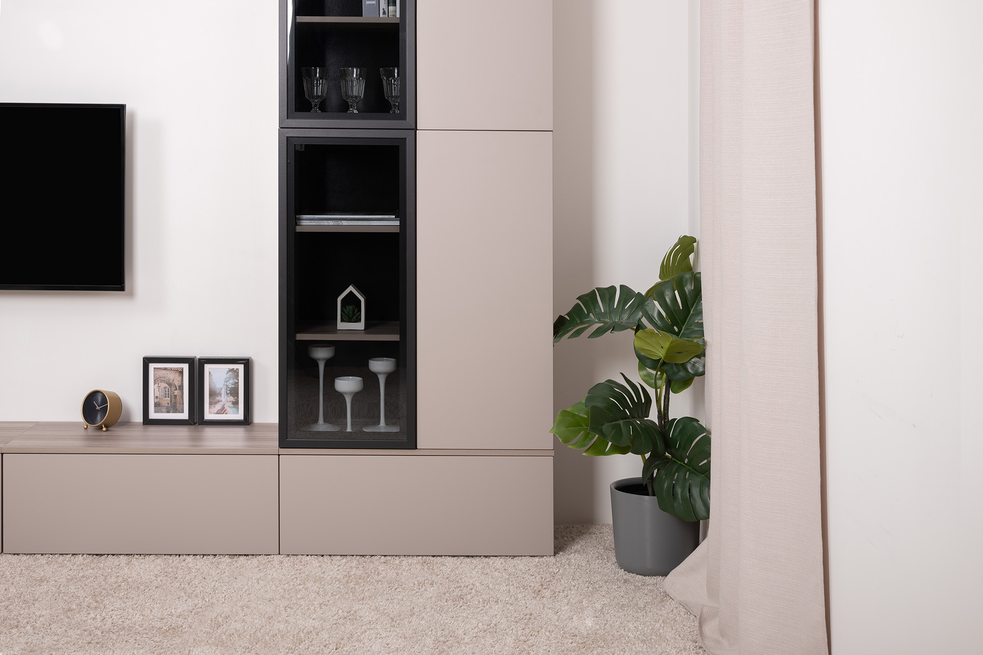 Разнообразие модулей и возможность их напольной и настенной установки позволит создать гостиную оптимальной конфигурации. Распашные фасады с механизмом push-to-open, направляющие скрытого монтажа в ящиках, петли с доводчиками, регулируемые опоры, крепеж в комплекте – комфорт продуман до мелочей.