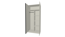 Шкаф разделен пополам по вертикали, одну половину занимают полки, вторая оснащена штангой