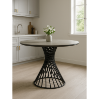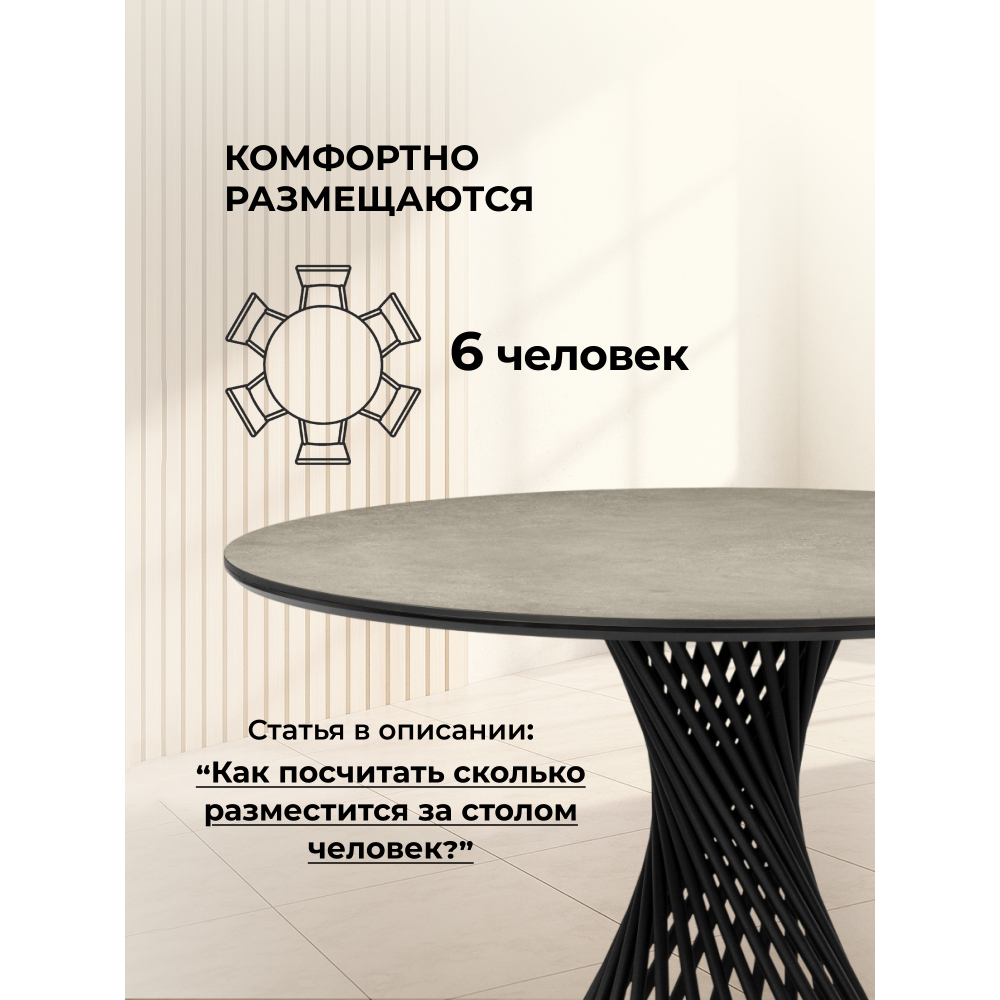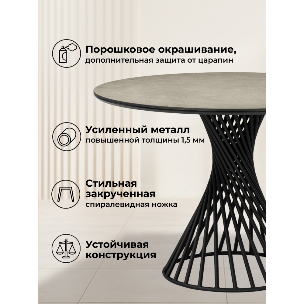 Обеденный стол Вивиен с круглой столешницей 110см. Основание из металла в черном цвете, оригинальной формы обязательно украсит ваш интерьер. Основа столешницы из МДФ - 16мм, сверху керамическое полотно - 6мм. Порошковое окрашивание - дополнительная защита от царапин. Массивные ножки толщиной 3мм. Устойчивая и надёжная конструкция