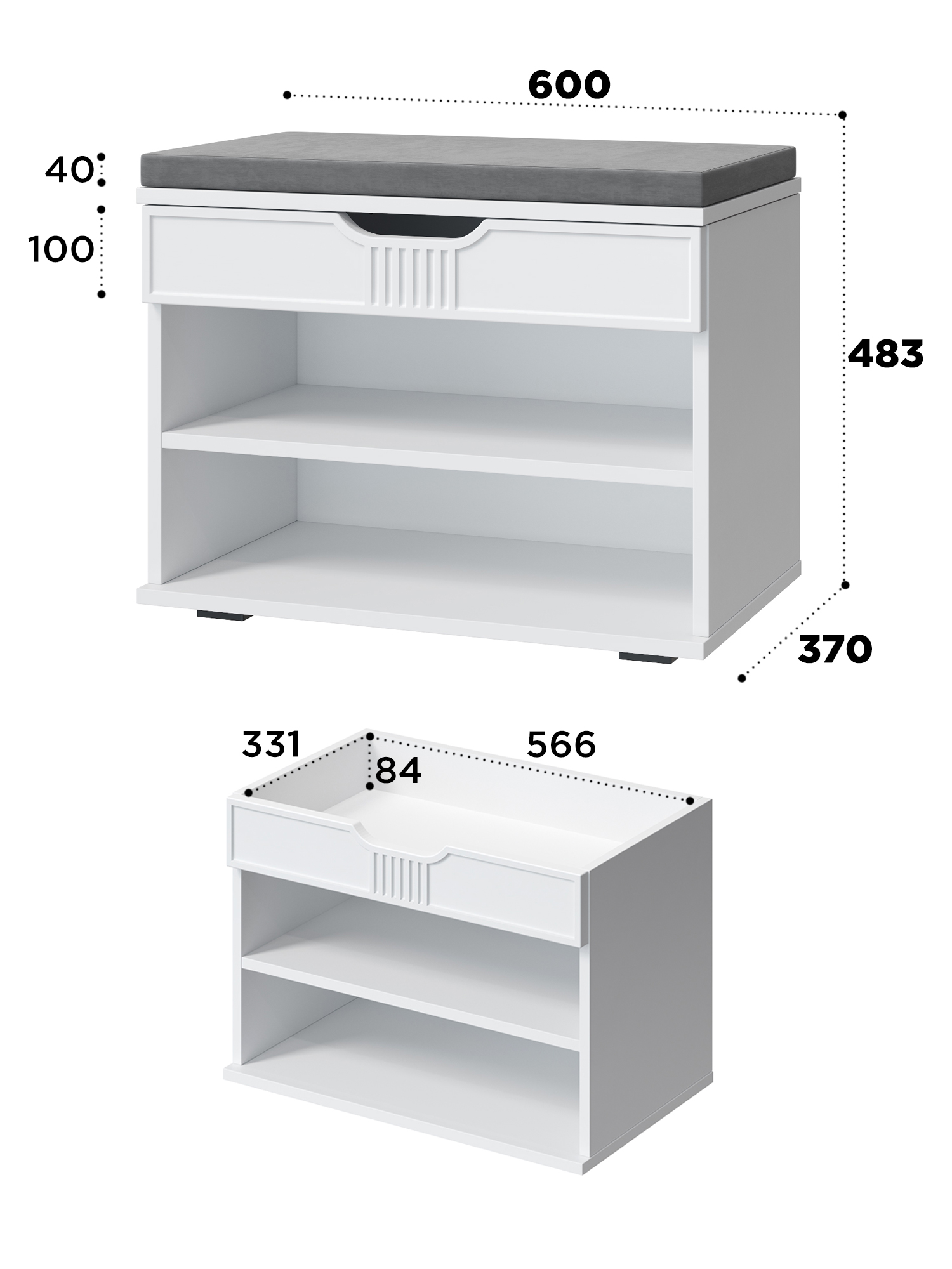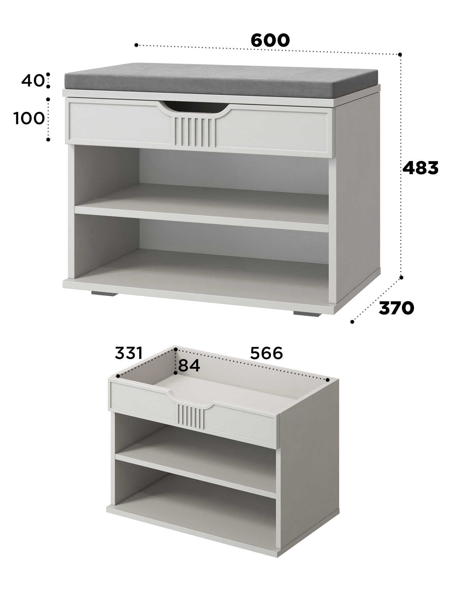 Тумба для обуви Эмилия ЭЛ-44К – компактная модель для комфортного переобувания в прихожую. Лаконичное изделие оборудовано двумя полками для обуви и мягким сиденьем, под которым находится удобный ящик для хранения чистящих средств, щеток или зонта. Ткань мягкой части велюр, наполнение: поролон 40 мм, синтепон, белый флизелин. Высота опоры 20 мм.