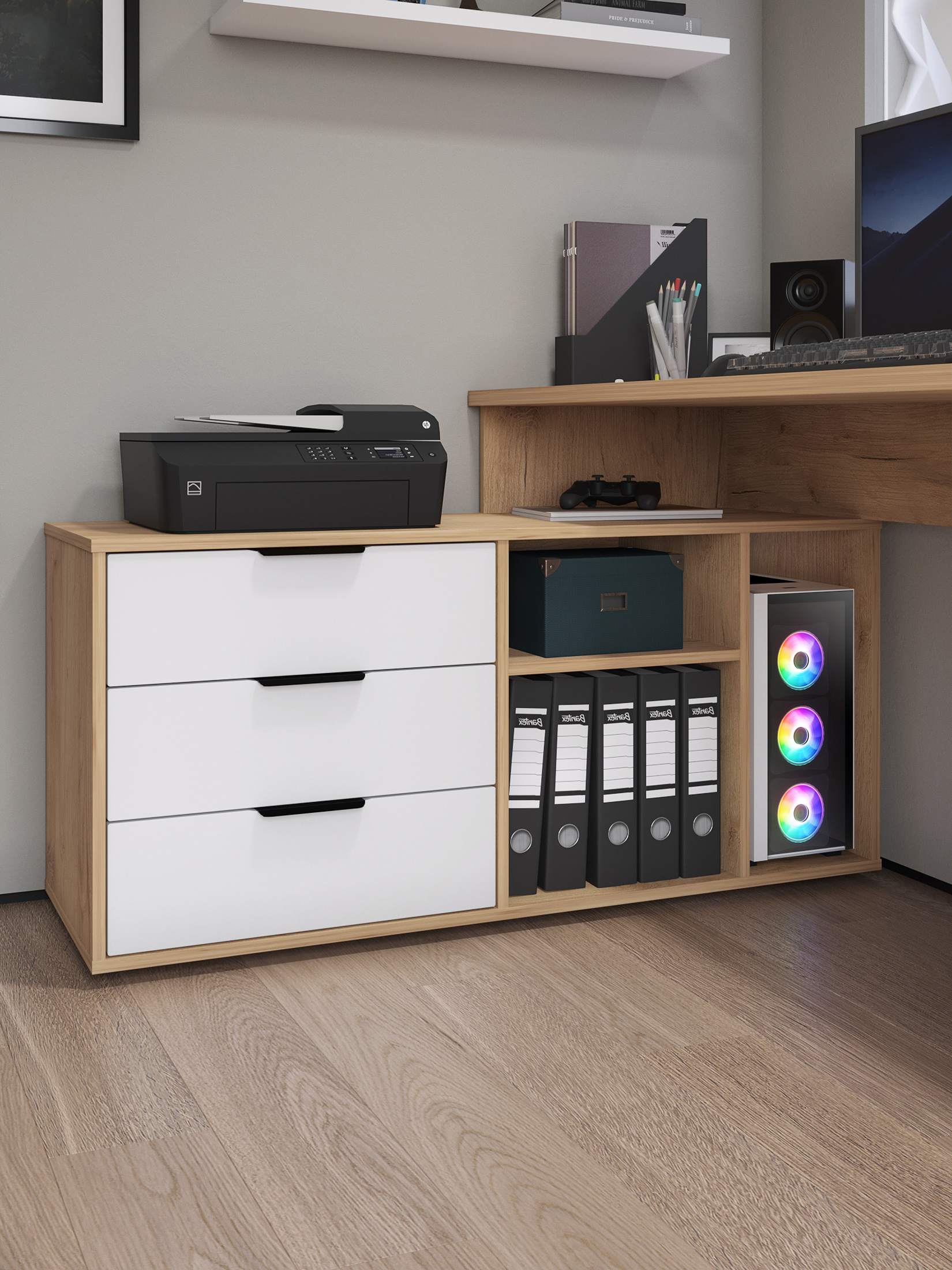 Размеры модуля (ш/в/г) в мм: 1269/1135/1004х880х553 Материал корпуса/фасада: ЛДСП 16 мм, МДФ 16 мм Основные характеристики стола ОП-21: дно ящиков — ДВП 3 мм. прочная стальная опора и тумба с четырьмя выдвижными ящиками для удобного хранения. столешница изготовлена из ЛДСП 16 мм. Преимущества стола ОП-21: Универсальность: подходит для использования в качестве письменного, компьютерного или маникюрного стола. Рекомендуется высокий стул. Фурнитура: телескопические направляющие полного выдвижения без доводчиков, металлические ручки и опора. Доставка и сборка: мебель поставляется в разобранном виде, в надежной упаковке, с подробной инструкцией по сборке. Сборка осуществляется самостоятельно или с привлечением специалистов.