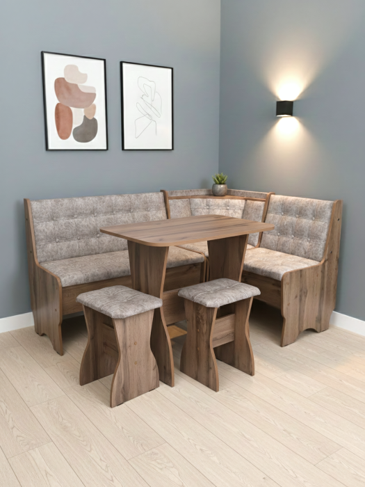 Кухонный уголок состоит из:Дивана углового,Стол прямоугольный НЕРАСКЛАДНОЙ Г*Ш*В 60*90*73 см.Изготовлен из ЛДСП.Обивка микровелюр ,наполнение поролон.Под сидениями дивана есть ящики для хранения.СБОРКА УНИВЕРСАЛЬНАЯ,КАК НА ЛЕВУЮ,ТАК И НА ПРАВУЮ СТОРОНУ!!!