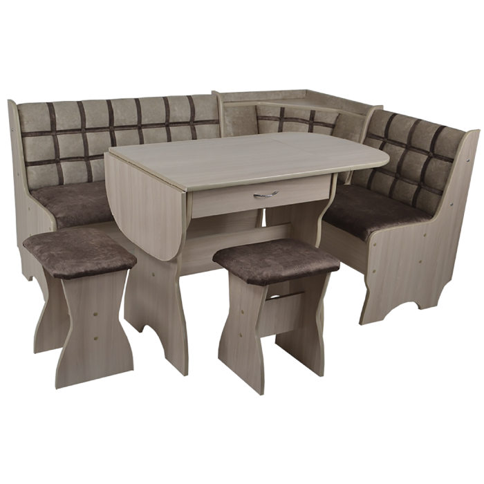 Кухонный уголок состоит из:Дивана углового,Стол-уши с ящиком (размер стола в разложенном виде 60*125.Выс 73.6.С опущенными ушами 60*70).+2 табурета (размер 29*39*45)Изготовлен из ЛДСП.Обивка велюр ,наполнение поролон.Под сидениями дивана есть ящики для хранения.СБОРКА УНИВЕРСАЛЬНАЯ,КАК НА ЛЕВУЮ,ТАК И НА ПРАВУЮ СТОРОНУ!!!