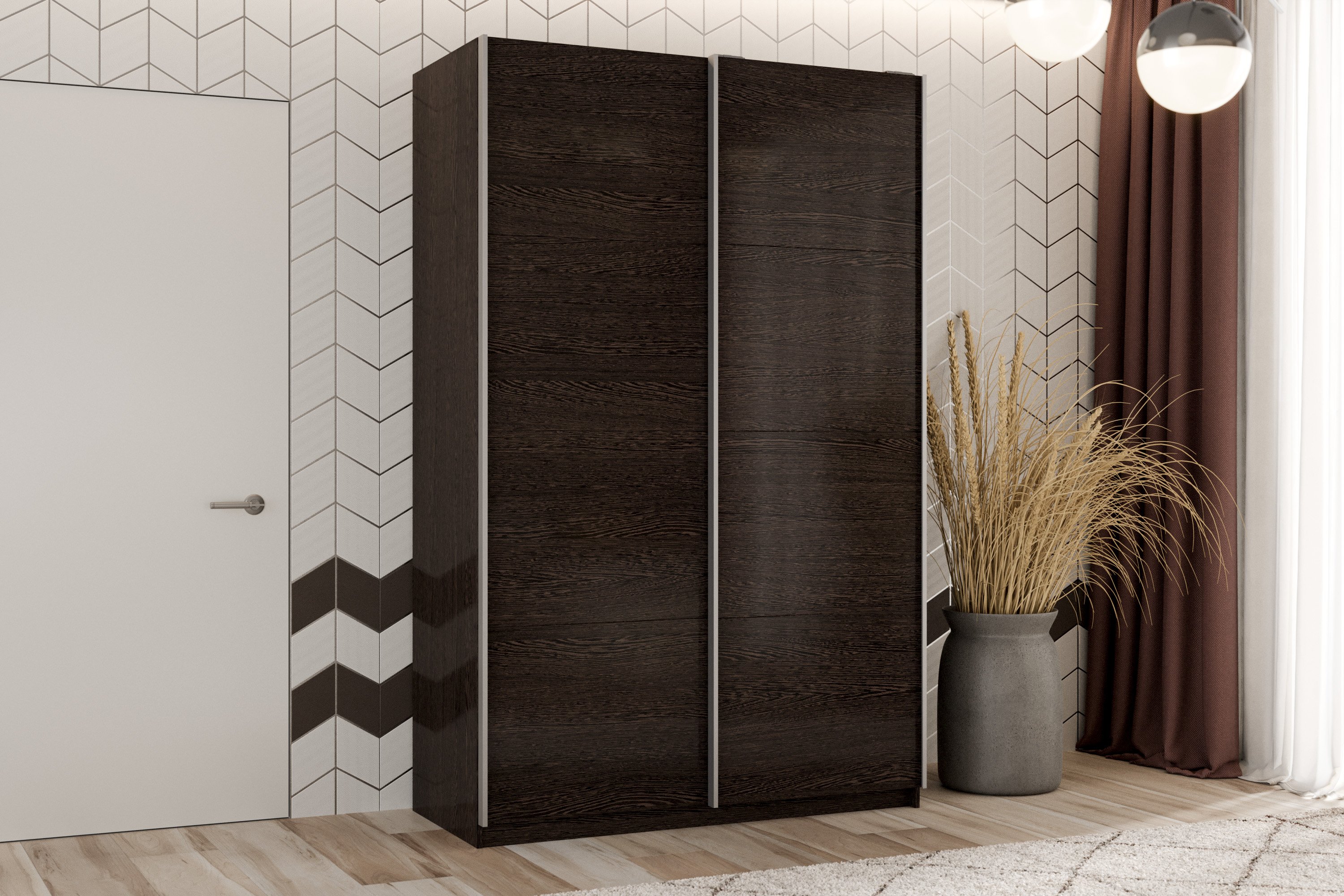 Лицевые элементы оформлены кромкой ПВХ толщиной 2 мм . Внутренние и скрытые детали защищены кромкой ПВХ толщиной 0,4 мм. Штанга для одежды расположена в левой части корпуса, выдерживает нагрузку до 22кг.