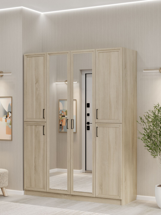 Шкаф распашной ШК‑4/3 — вместительное и функциональное решение для организации хранения в спальне, гостиной или прихожей. Четырёхдверный шкаф с тремя штангами и полками позволяет эффективно использовать пространство, сочетая эргономичность с высокой вместимостью. Фасад из МДФ и корпус из ЛДСП обеспечивают надёжность конструкции, долговечность и привлекательный внешний вид. Нейтральный дизайн шкафа органично вписывается в современные интерьеры разных стилевых направлений.