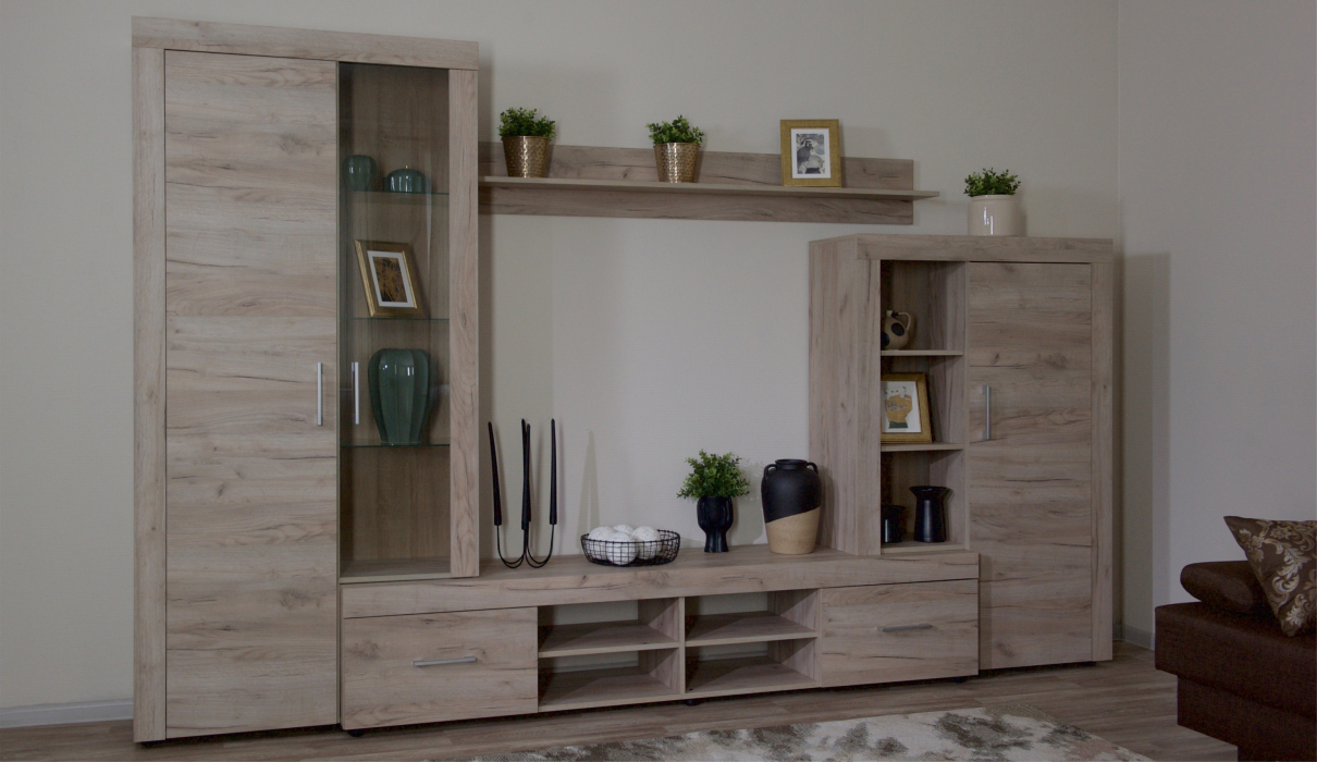Стенка Джерси – светлая, компактная и функциональная. Беспроигрышный вариант для небольших комнат. В модели используются утолщенные линии корпуса, вместительные ящики полного выдвижения, регулируемые ножки. Благодаря модным и стильным цветовым решениям, гостиная подойдет под любой интерьер, создаст дома теплую уютную атмосферу.