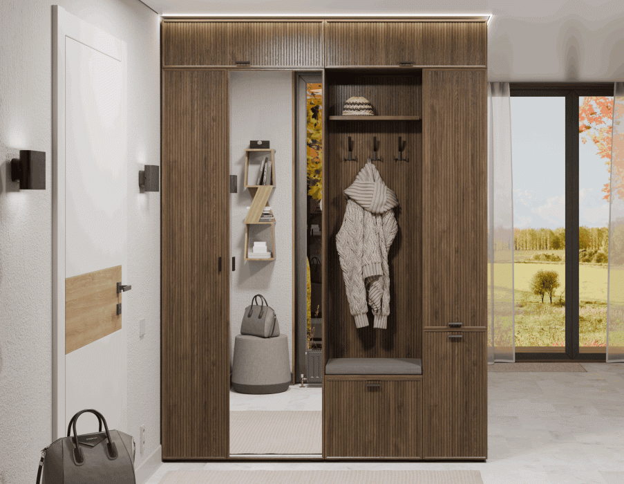 Прихожие СТЕЛЛА воплощают в себе актуальные тенденции мировой мебельной моды и позволяют создавать функциональные интерьеры в современном стиле, обеспечивающие высокий уровень комфорта. Сочетание нейтральных фоновых цветов и акцентных текстур дерева дают возможность открыть новые грани интерьера. Возможность использования различных вариантов вставки — дополнительное преимущество при планировании прихожей.