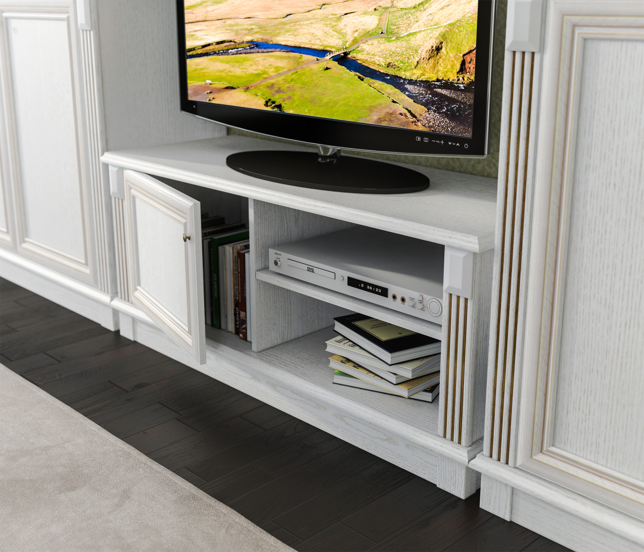 Габаритные размеры – ширина 120 см, высота 53 см и глубина 44 см. Вес тумбы 36,85 кг, что даёт возможность передвигать её по усмотрению. Под столешницей расположены две открытых полки и отделение с отдельной дверцей. Тумба выполнена в классическом дизайне из прочного современного КДСП в цвете «Белый Ясень», рамочный фасад выполнен из МДФ.