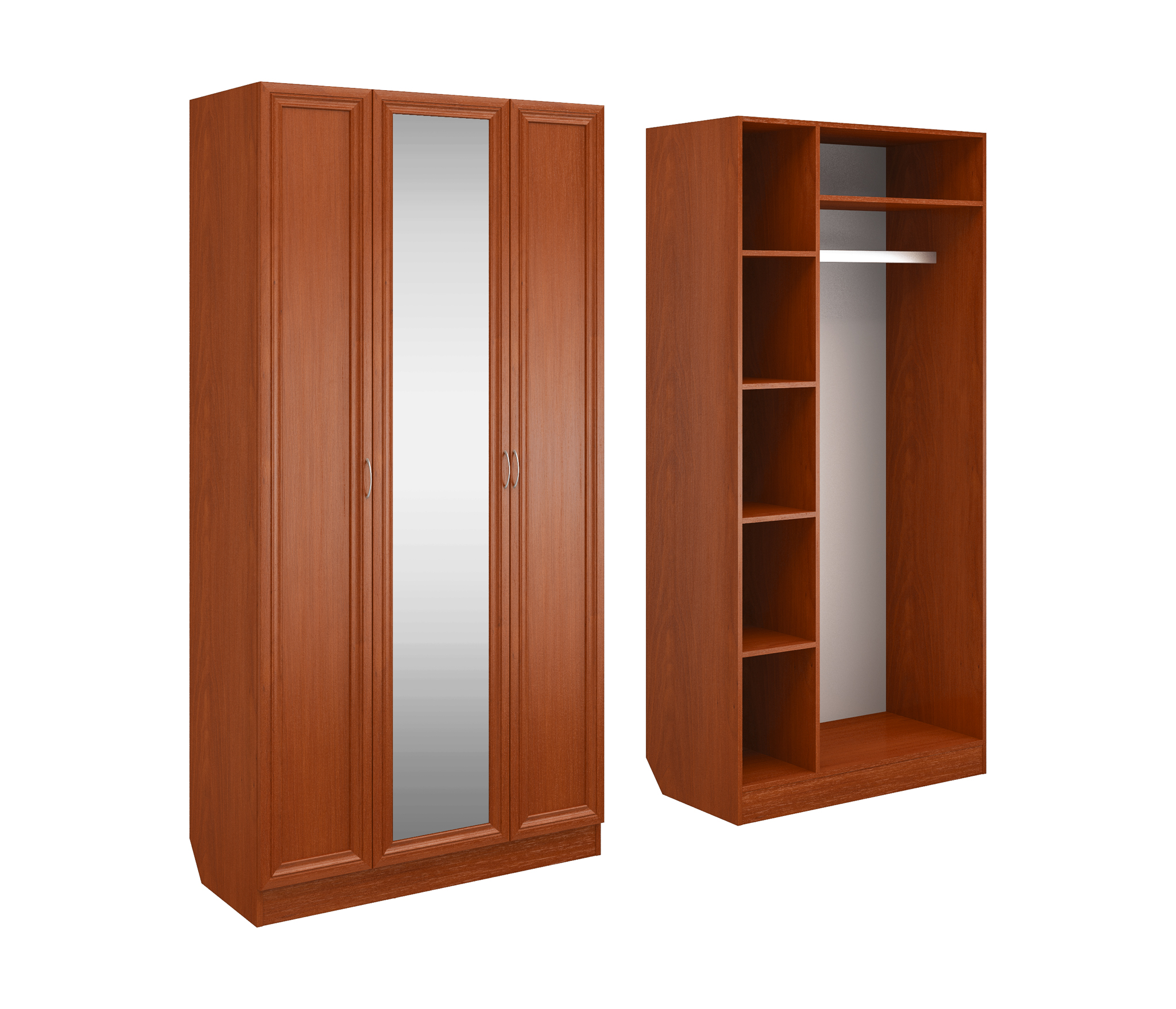 Корпус шкафа выполнен из Ламинированной ДСП высокого качества с насыщенным цветом. Фасады выполнены из материала МДФ.Ширина шкафа 100 см., большая и функциональная трёхстворчатая модель. В левой секции ниши для сложенных вещей. Справа штанга для одежды.В данной моделе установлено зеркало, которое монтируется на производстве в рамку фасада двери шкафа