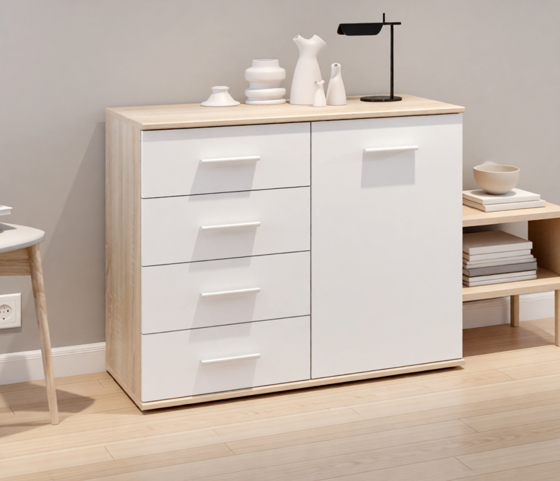 Комод Мамбо выполнен из прочного и влагоустойчивого материала. Все выдвижные механизмы прочные и имеют солидный ресурс.