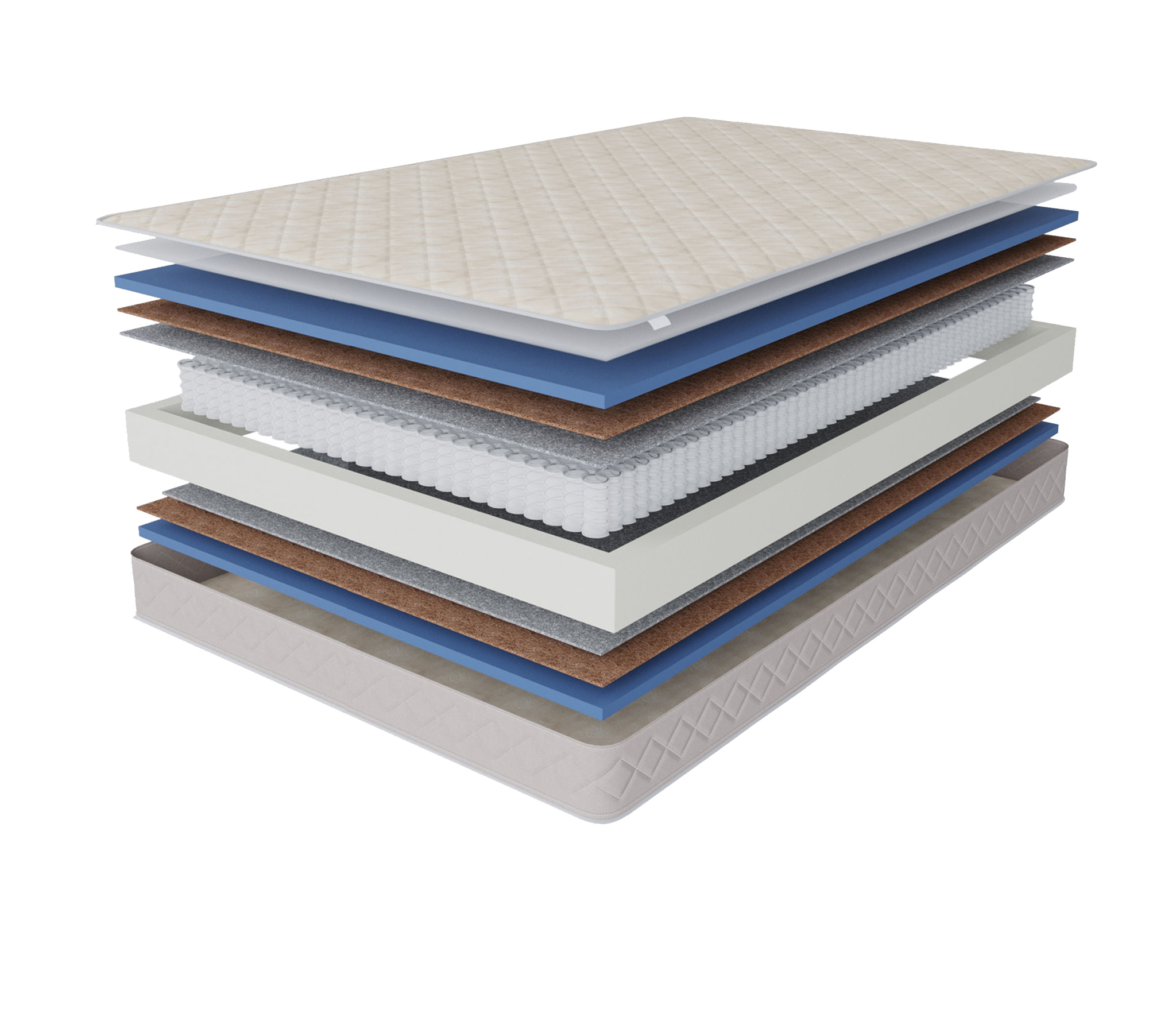 Это классическая конструкция матраса, универсальный блок пружин с точечной поддержкой, термоволокно, которое защитит комфортные слои от соприкосновения с пружинами и соответственно истерания. Слои кокоса добавят необходимой жесткости и прочности.