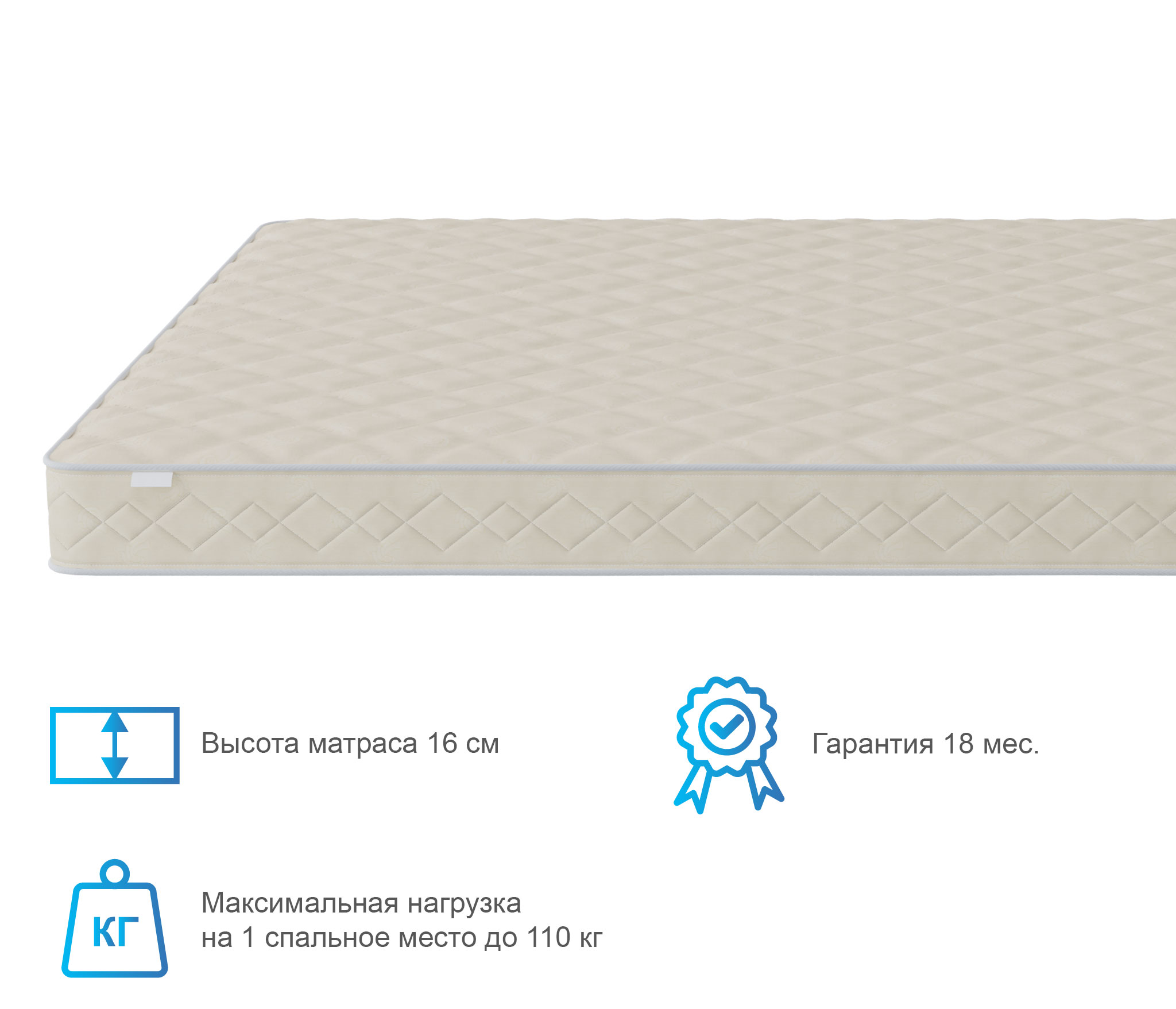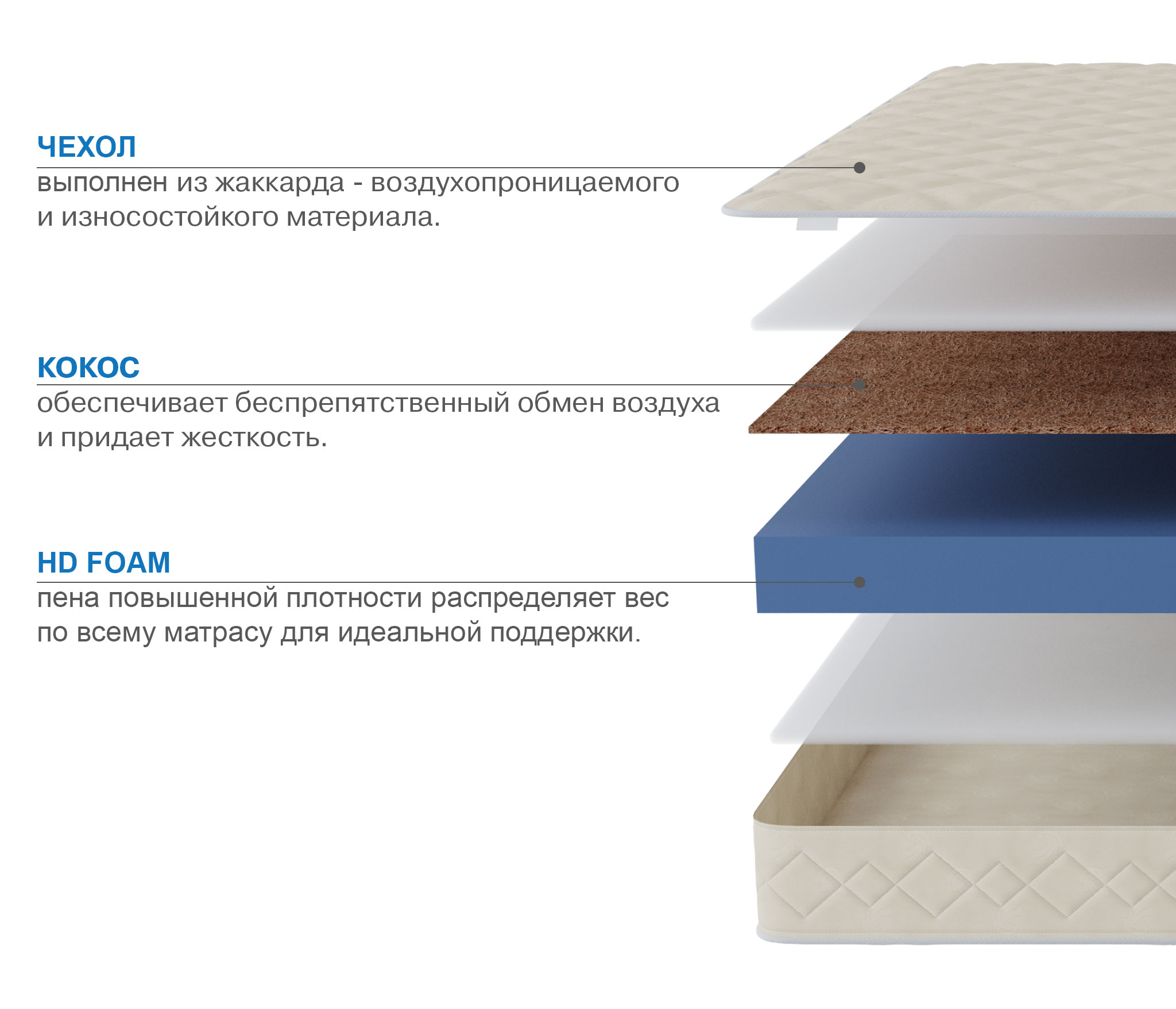 Отличный беспружинный матрас с разной степенью жесткости сторон. В качестве основы используется эластичная, но при этом довольно прочная и жесткая пена. Одна из сторон матрас дополнительно армирована листом латексированного кокоса, который придаст дополнительную прочность и жесткость. Матрас достаточно легкий и подходит для кроватей с подъемным механизмом, а так же для детских и молодежных кроватей с низким бортиком. При выборе матраса следует помнить о том, что любой матрас не отвечает за правильность положения головы и шеи, их здоровье зависит от правильно подобранной ортопедической подушки. Для увеличения срока службы матраса рекомендуется его использование с защитным чехлом AquaStop. |